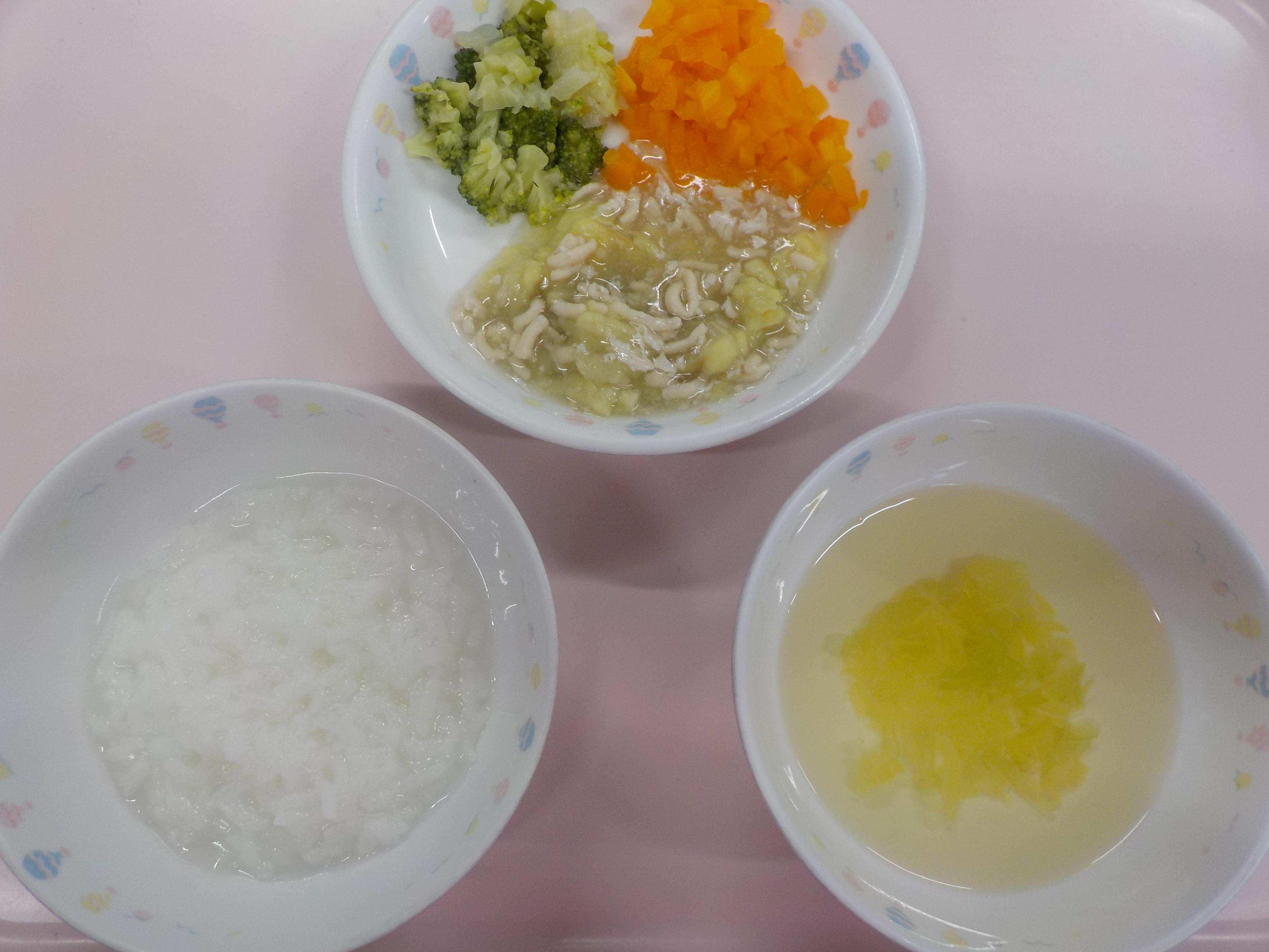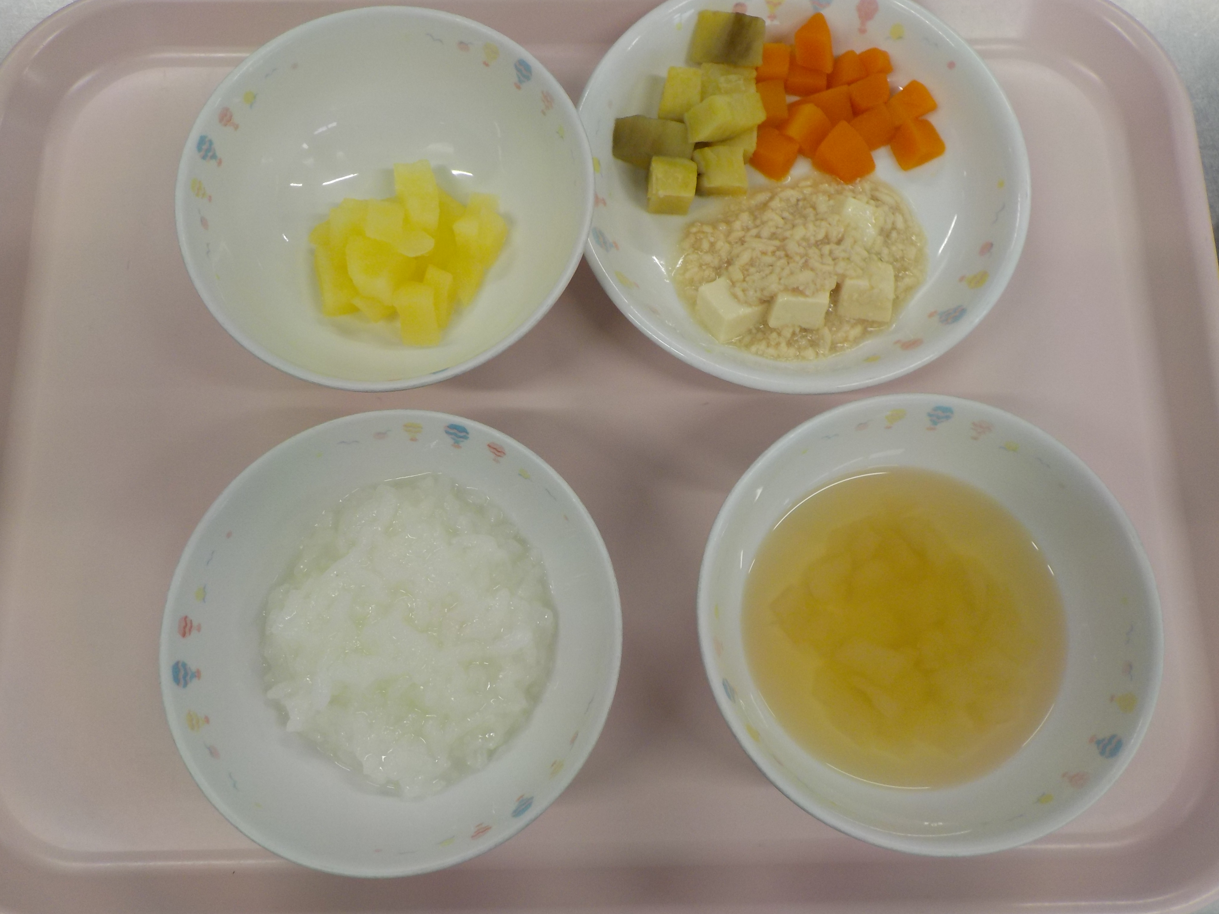 ・おかゆ・豆腐のそぼろ煮・人参とさつま芋煮・白菜スープ・りんご煮