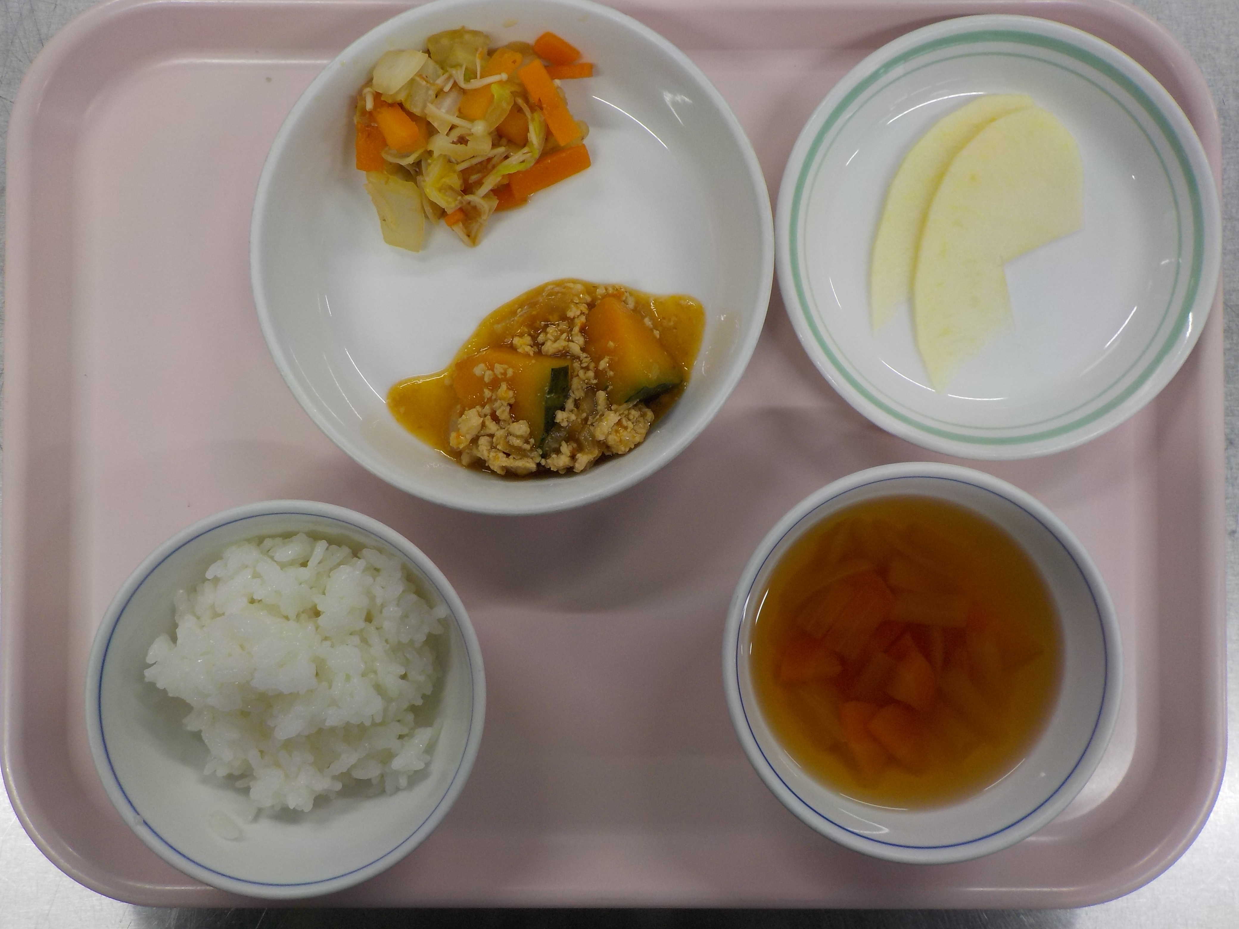 ・ご飯・かぼちゃのそぼろあんかけ・おかか和え・すまし汁・りんご