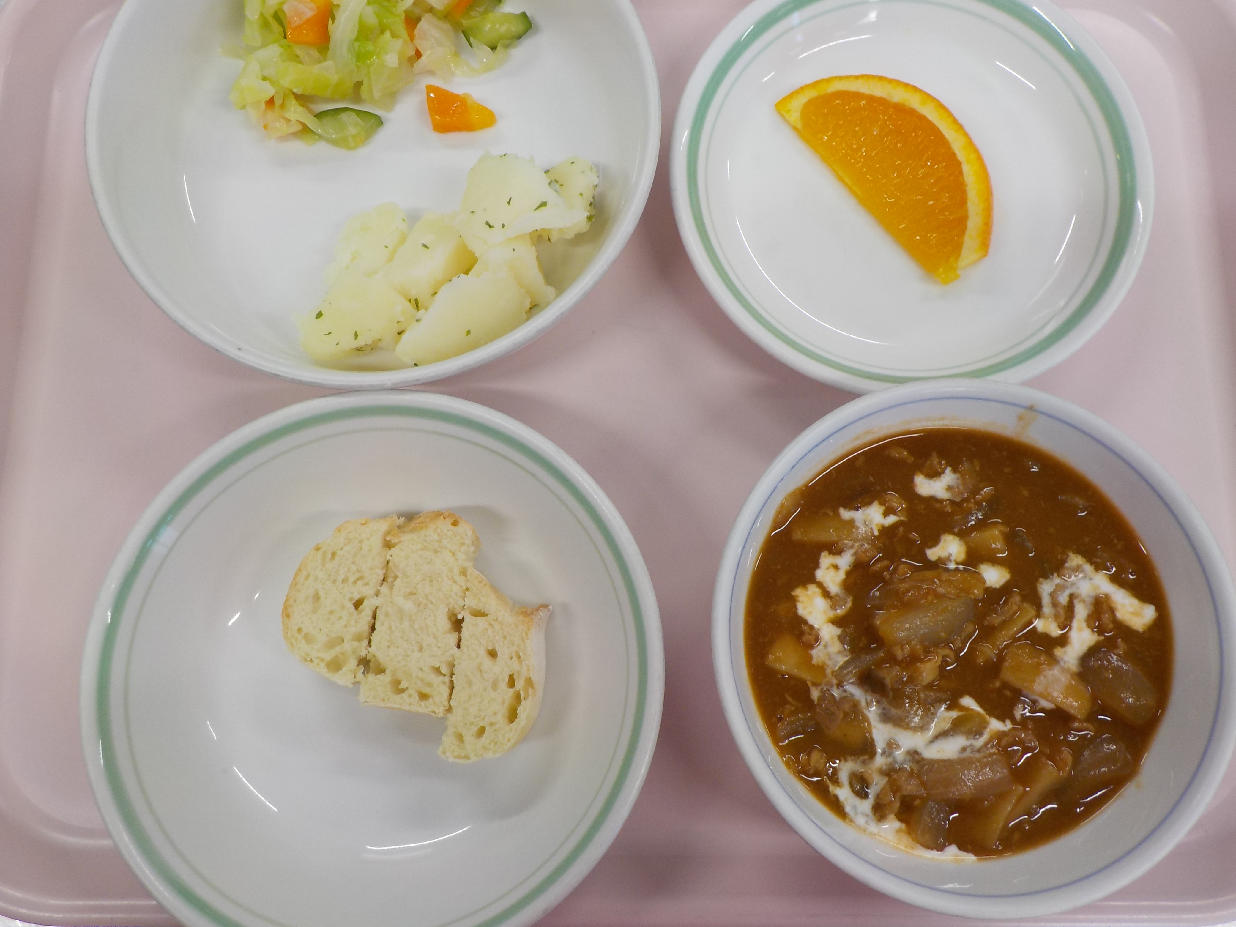 ・パン・白身魚とキャベツ煮・人参とじゃが芋煮・白菜スープ・オレンジ