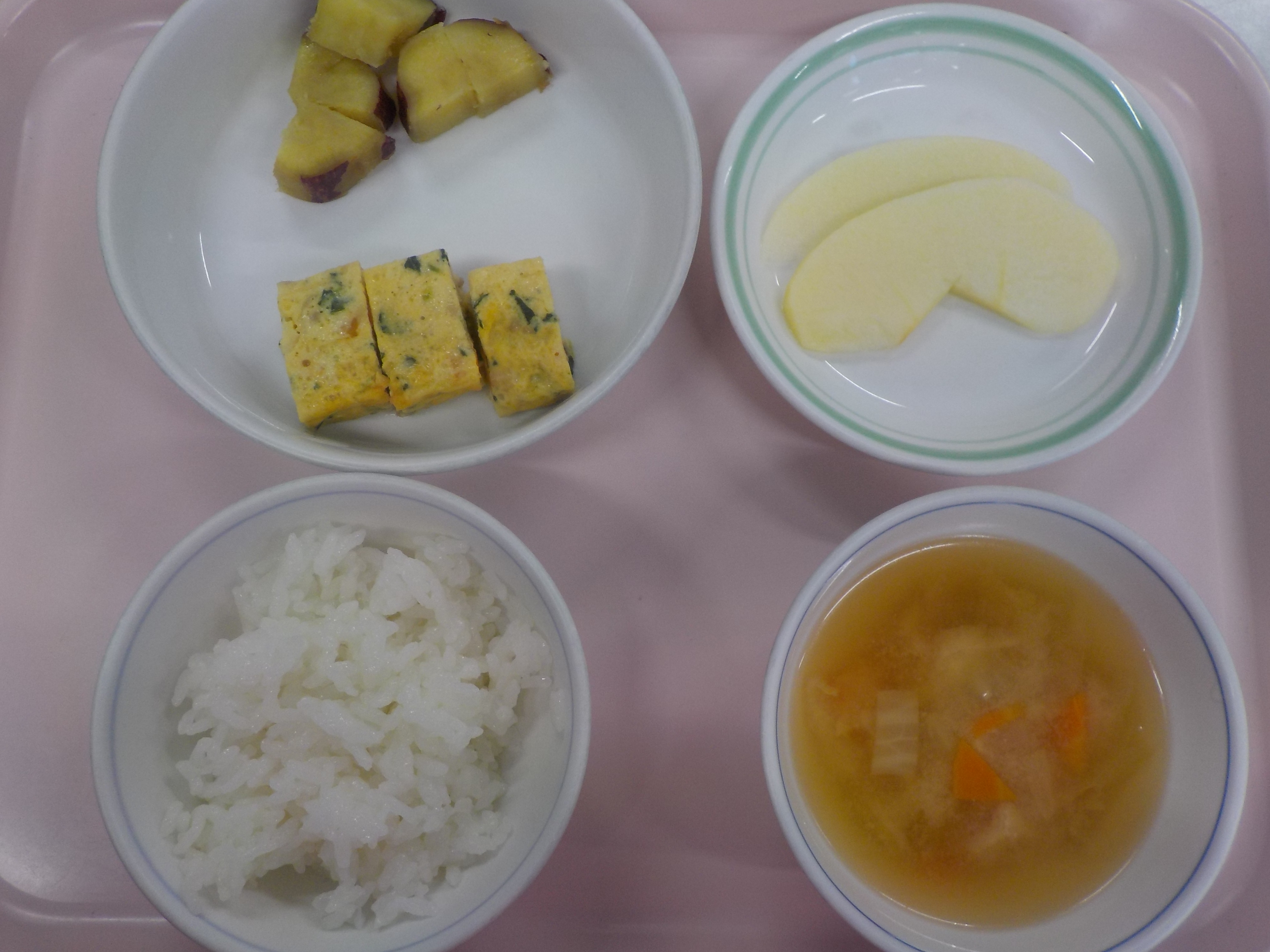 ・ご飯・千草焼・ふかし芋・味噌汁・りんご