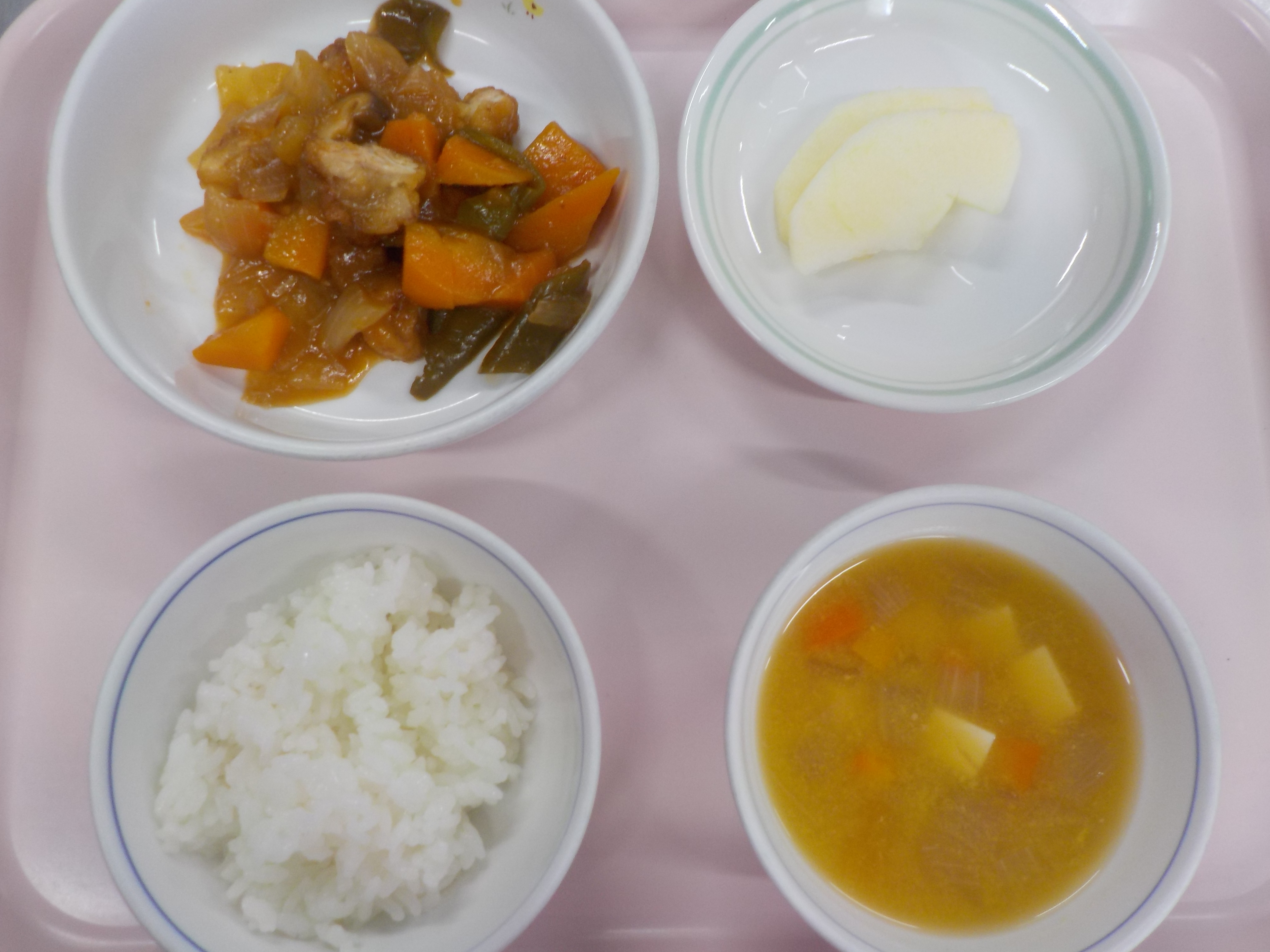 ・ご飯・酢鶏・中華コーンスープ・りんご