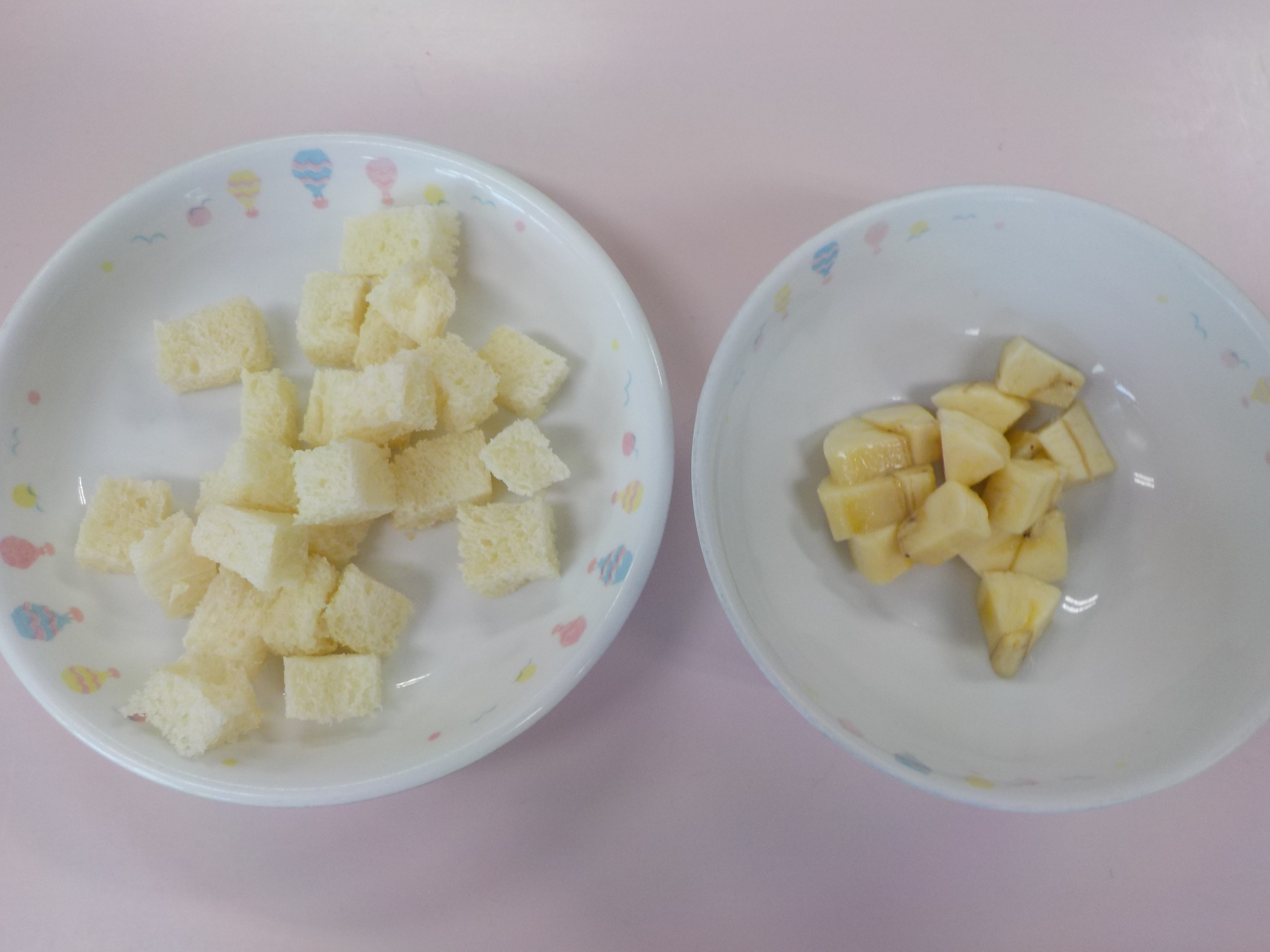 ・おかゆ・じゃが芋のそぼろ煮・人参と玉ねぎ煮・キャベツスープ・りんご煮