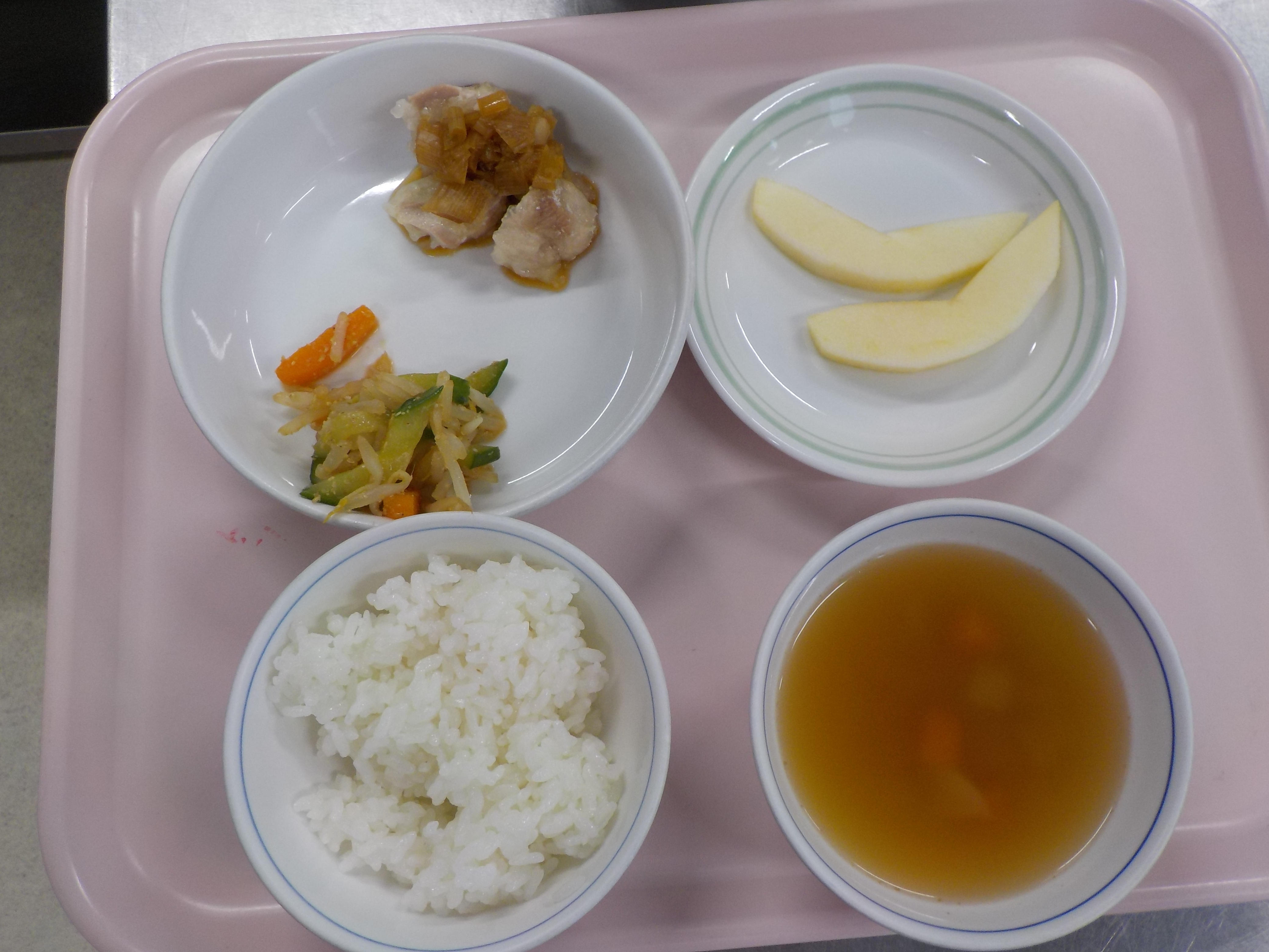 ・ご飯・油淋鶏風・中華サラダ・中華スープ・りんご
