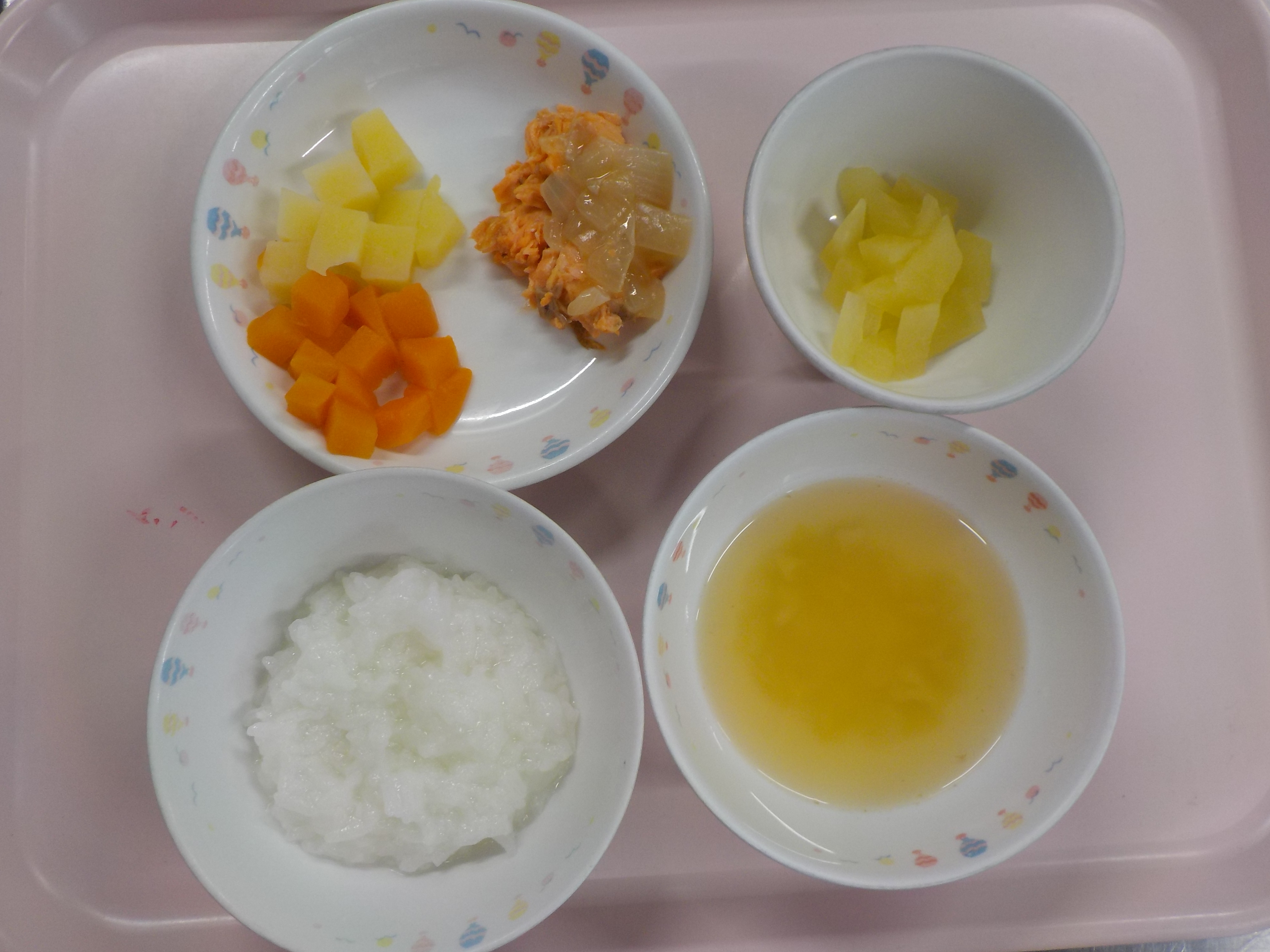 ・おかゆ・鮭と玉ねぎ煮・人参とじゃが芋煮・キャベツのスープ・りんご煮