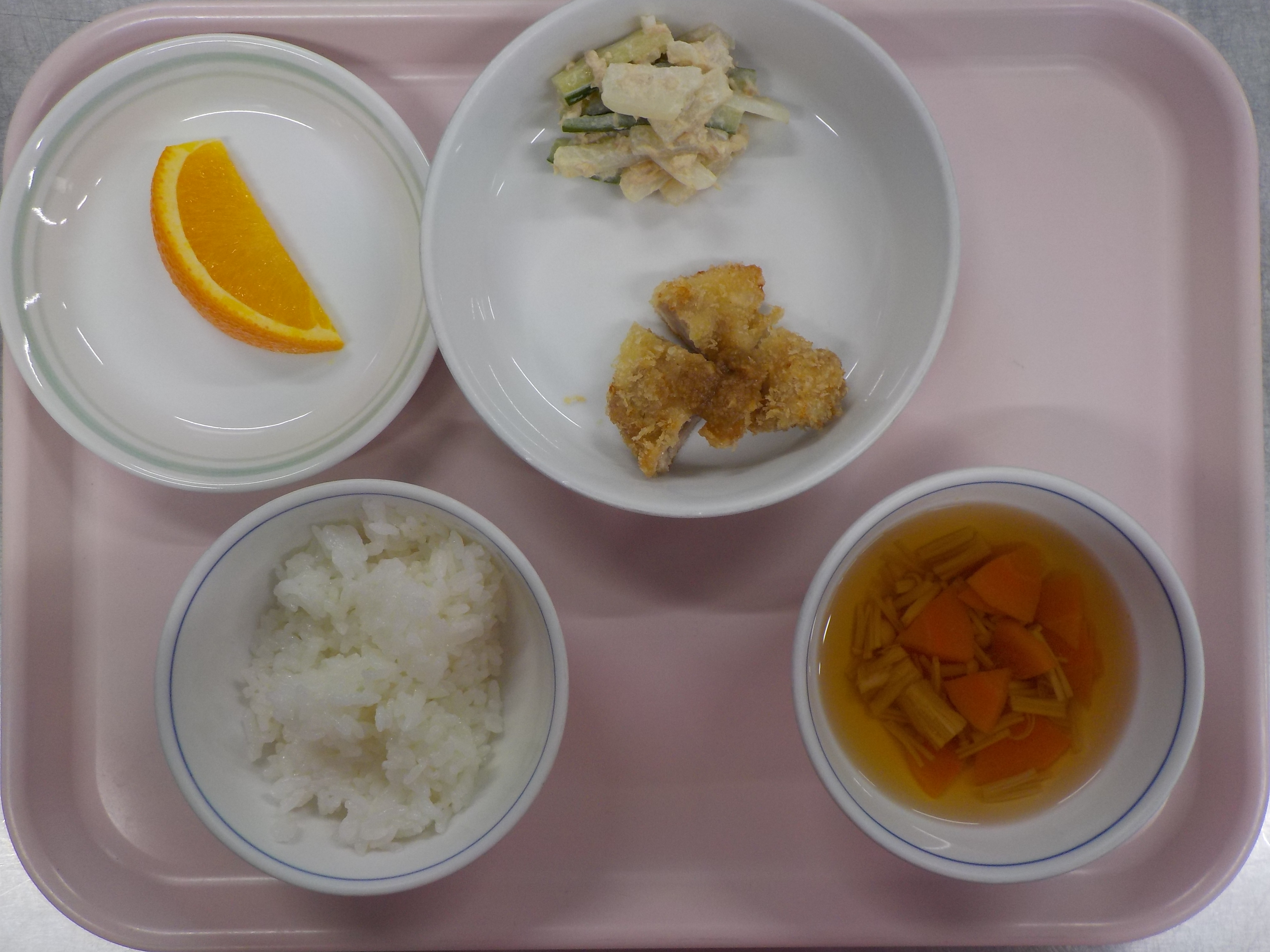 ・ご飯・味噌カツ・大根サラダ・すまし汁・オレンジ