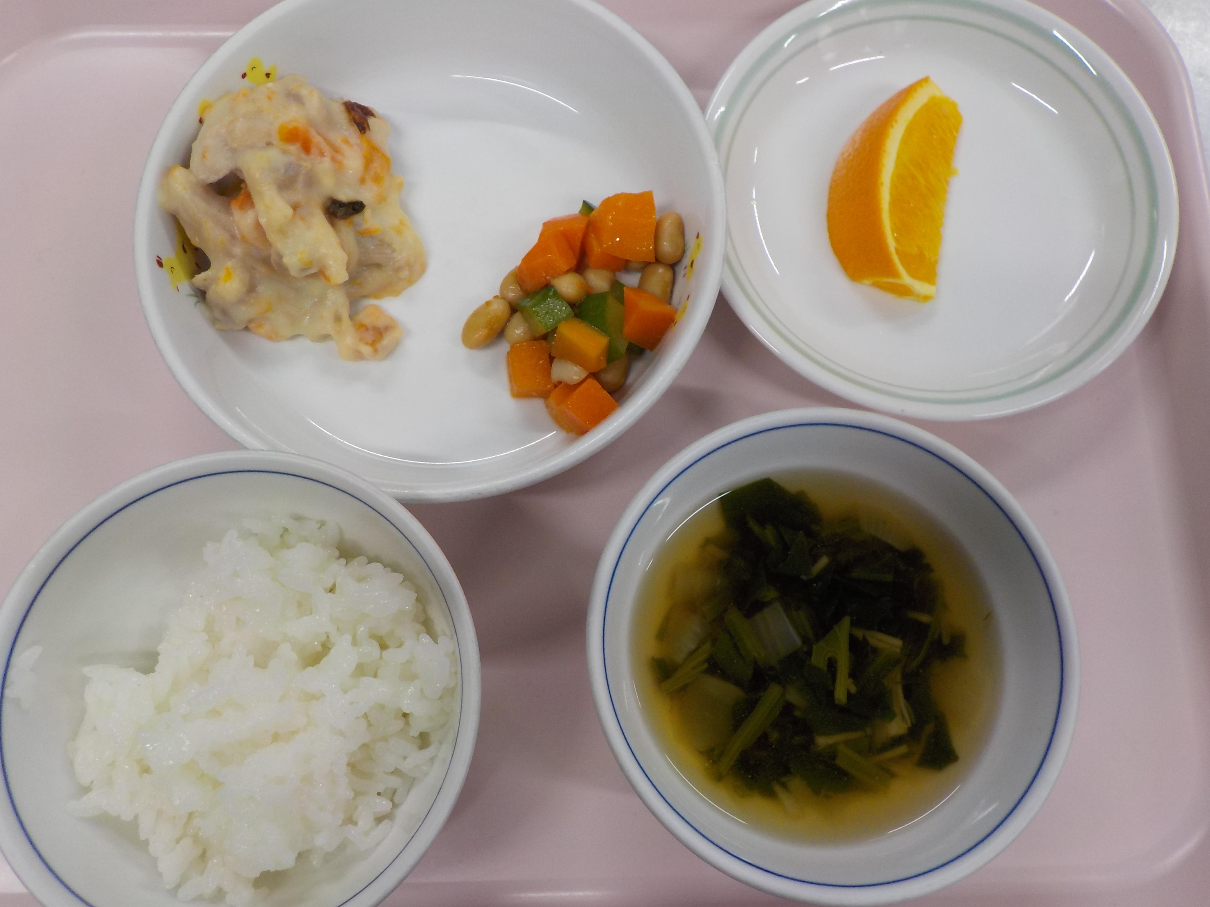 ・根菜の味噌グラタン・大豆サラダ・和風コンソメスープ・オレンジ