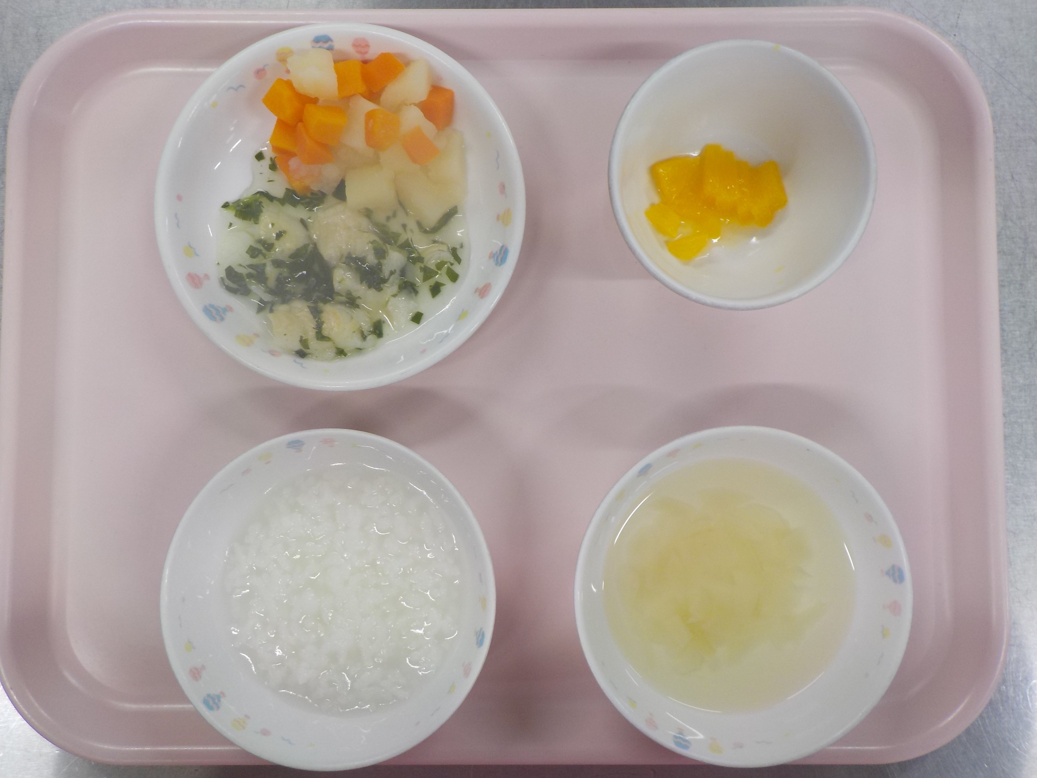 ・おかゆ・白身魚のほうれん草煮・人参とじゃが芋煮・玉ねぎの味噌汁・オレンジ