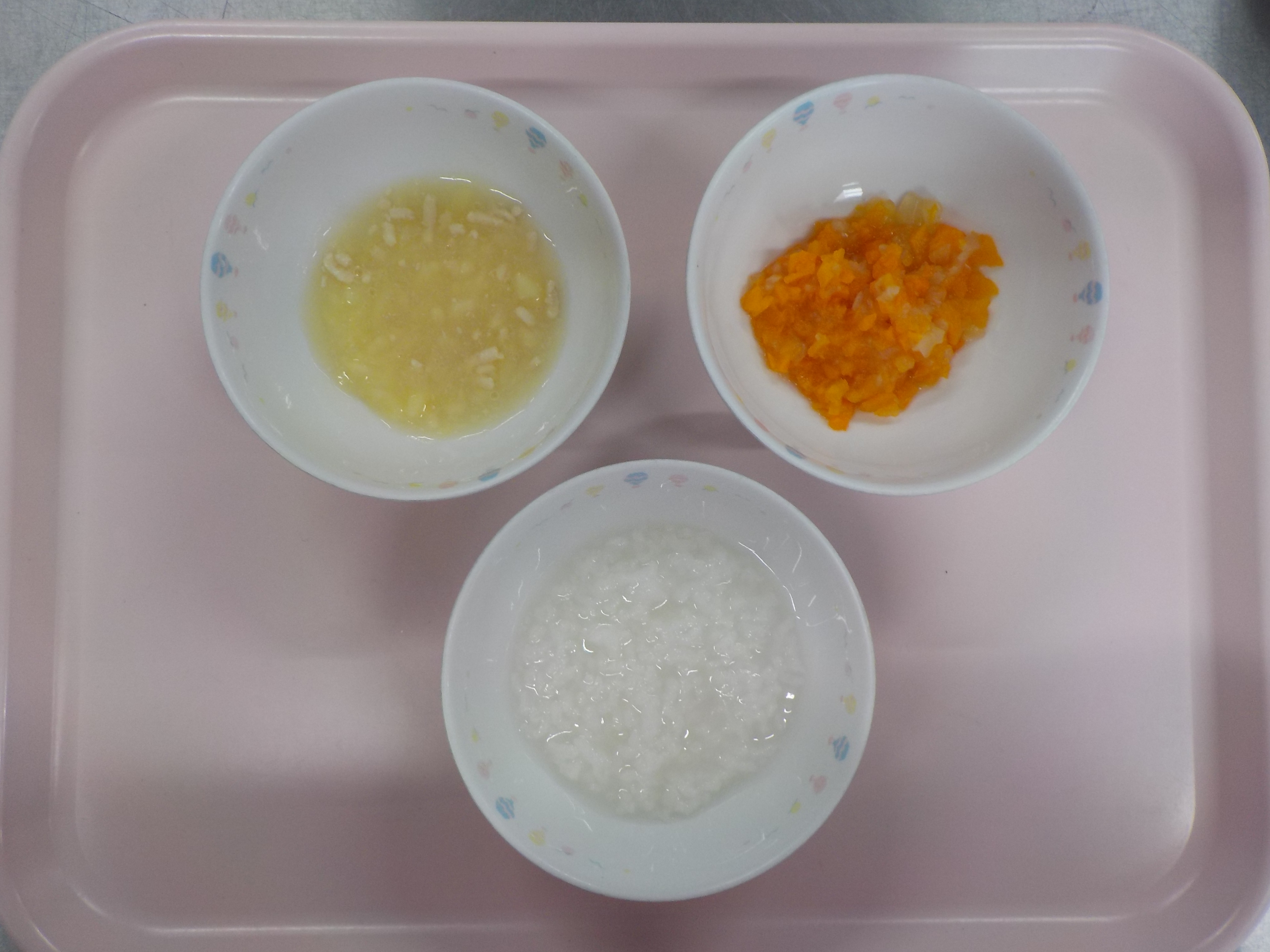 ・おかゆ・じゃが芋のそぼろ煮・人参と玉ねぎ煮