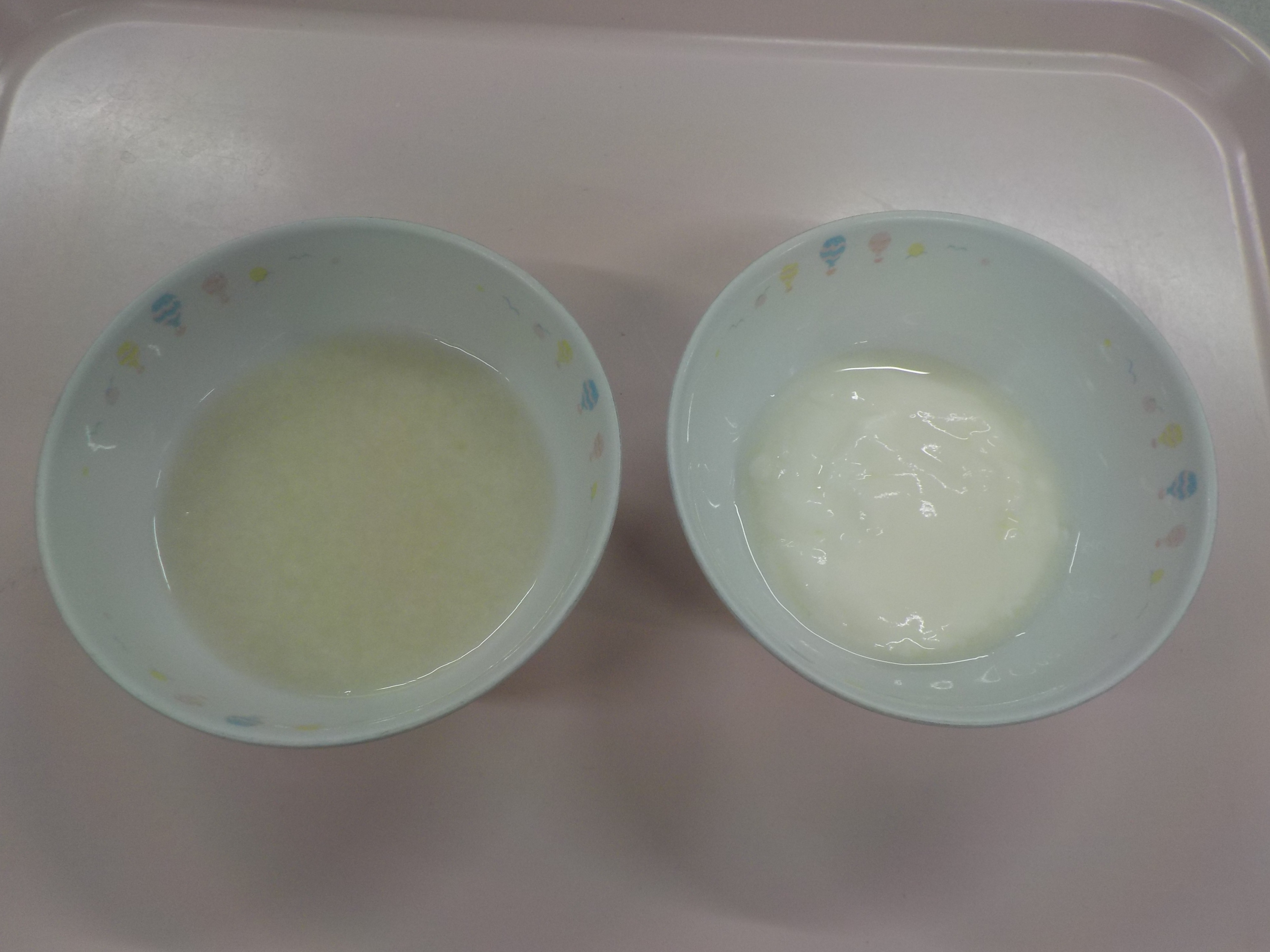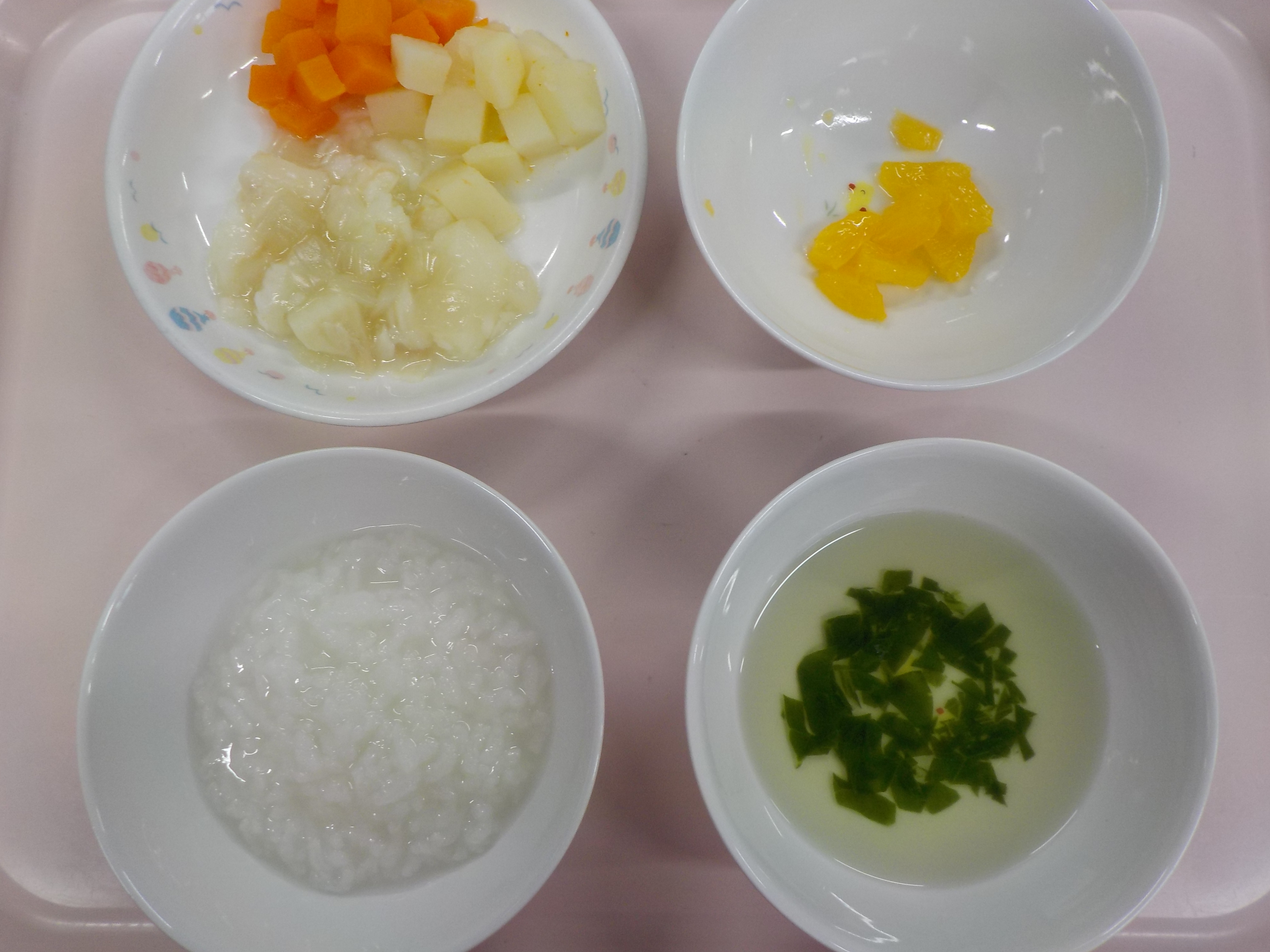 離乳食(中期食)・おかゆ・白身魚と玉ねぎ煮・人参とじゃが芋煮・ほうれん草スープ・オレンジ