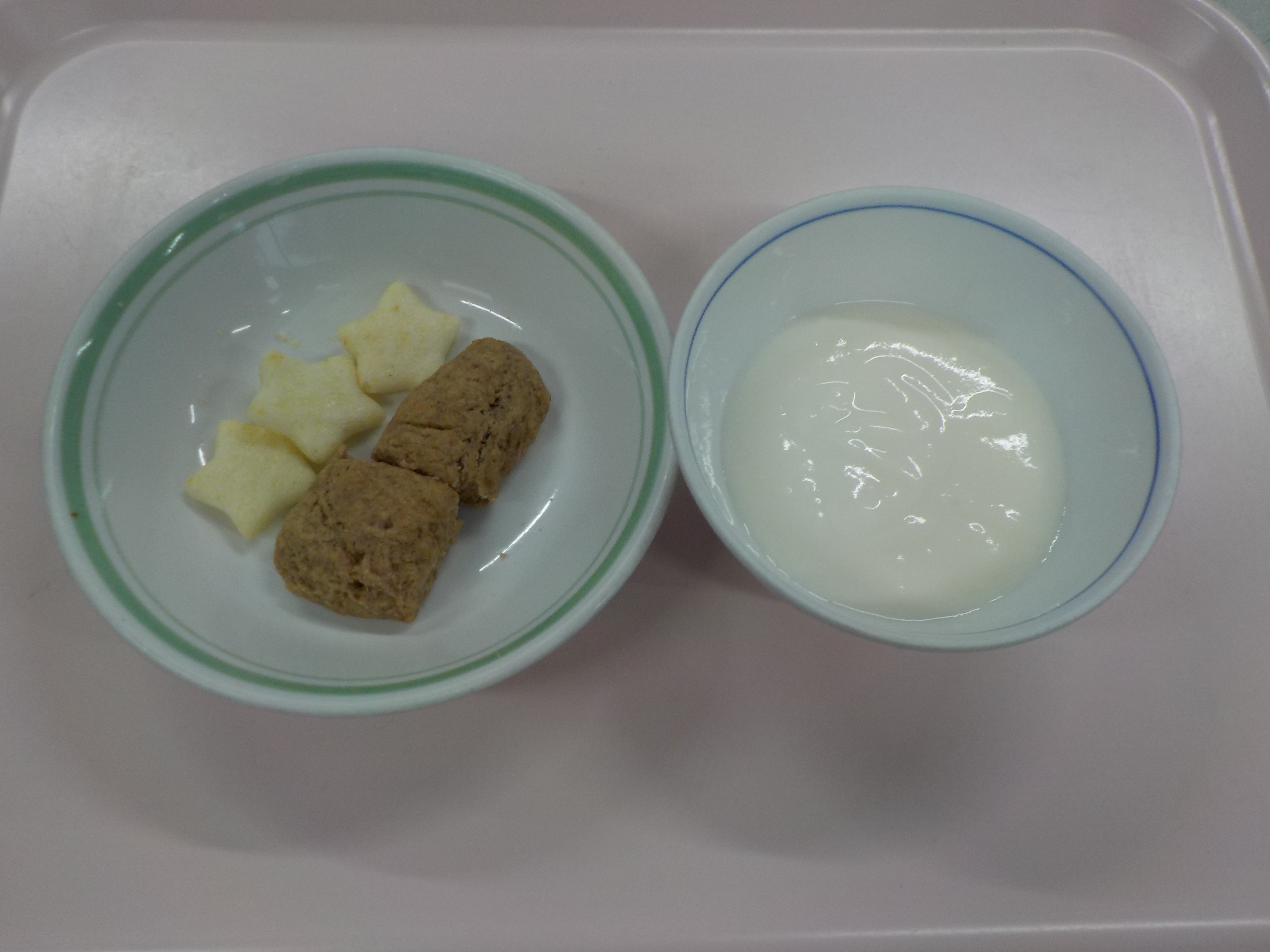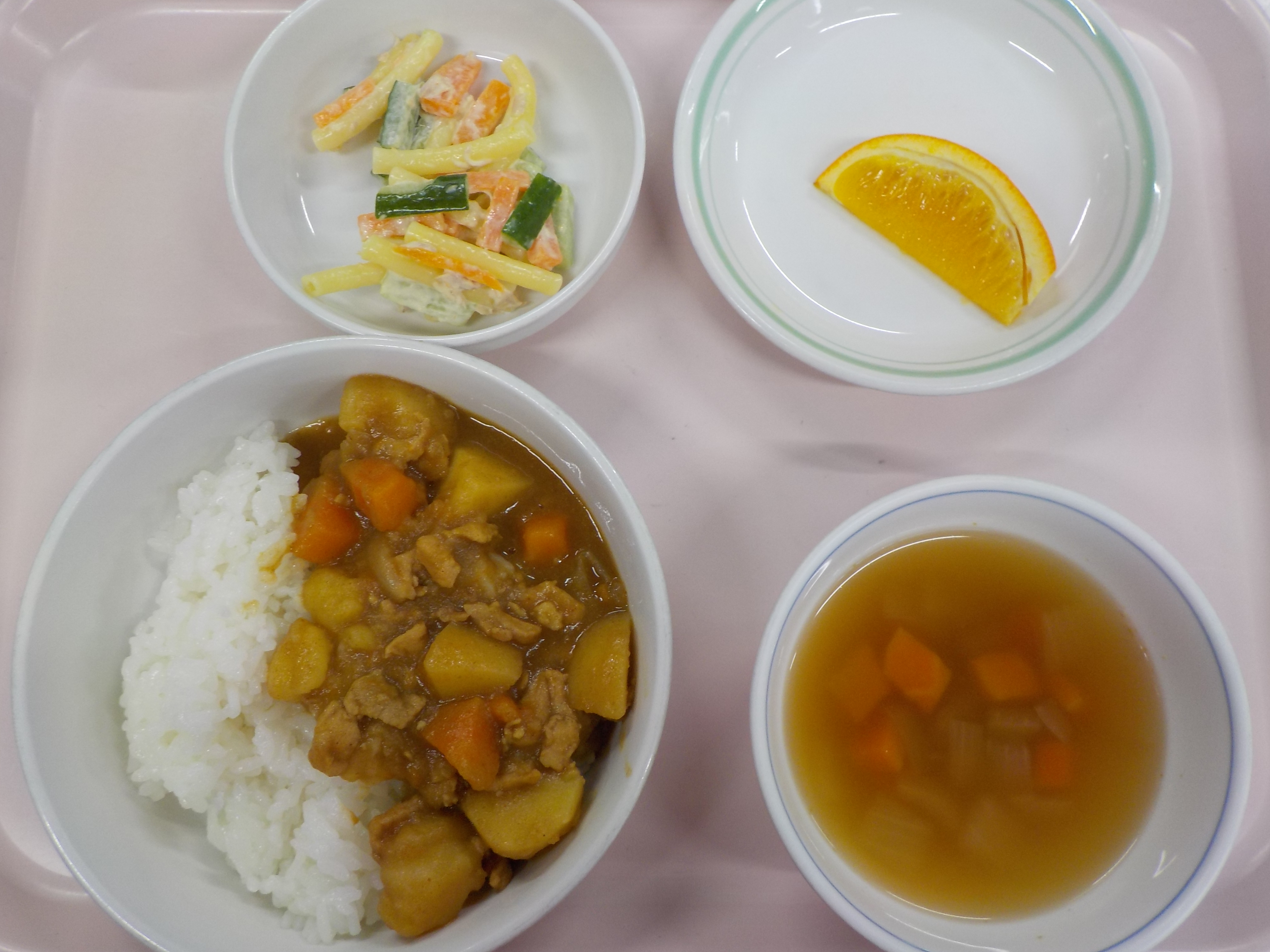 2歳児  ・チキンカレー・マカロニサラダ・スープ・オレンジ・菓子盛り合わせ・ヨーグルト