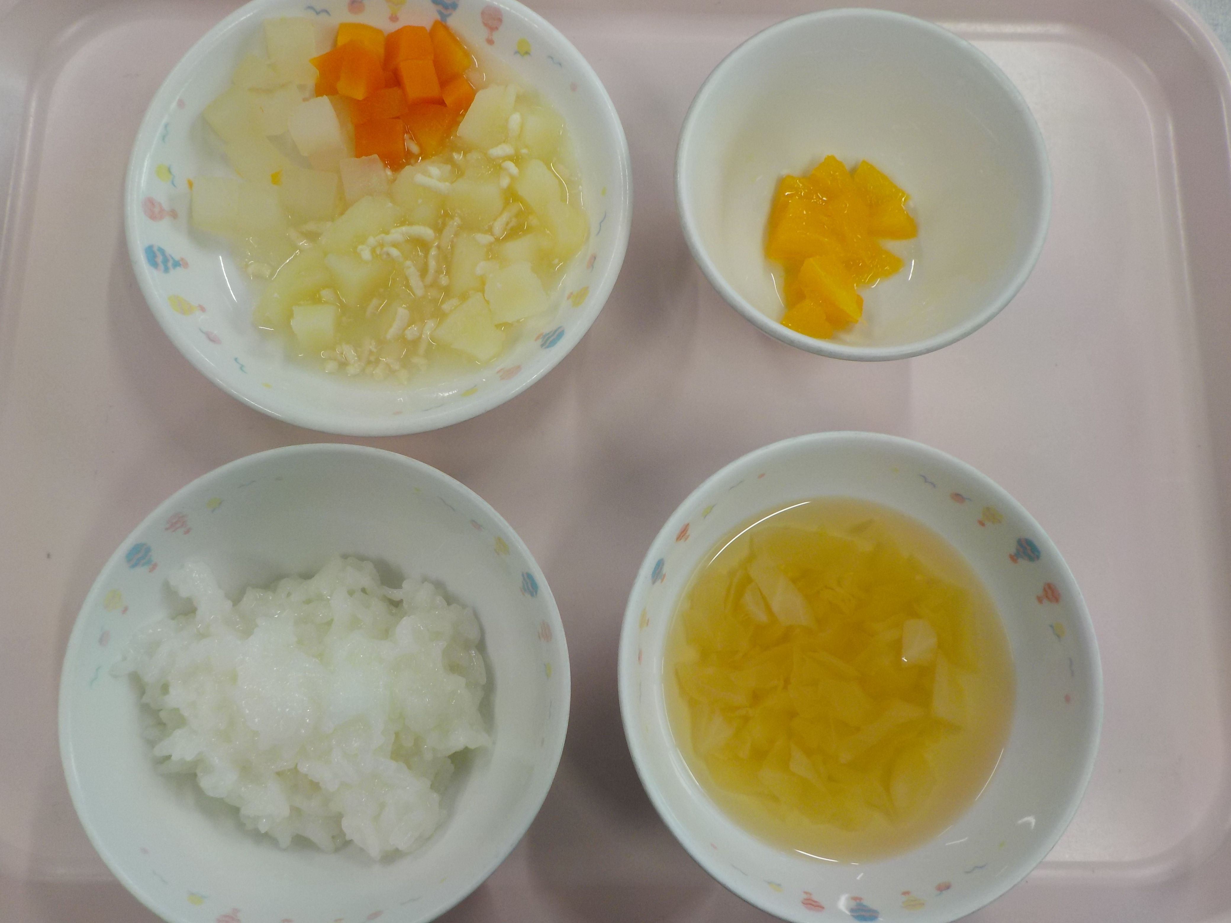 ・軟飯・じゃが芋のそぼろ煮・人参と大根煮・キャベツのすまし汁・オレンジ