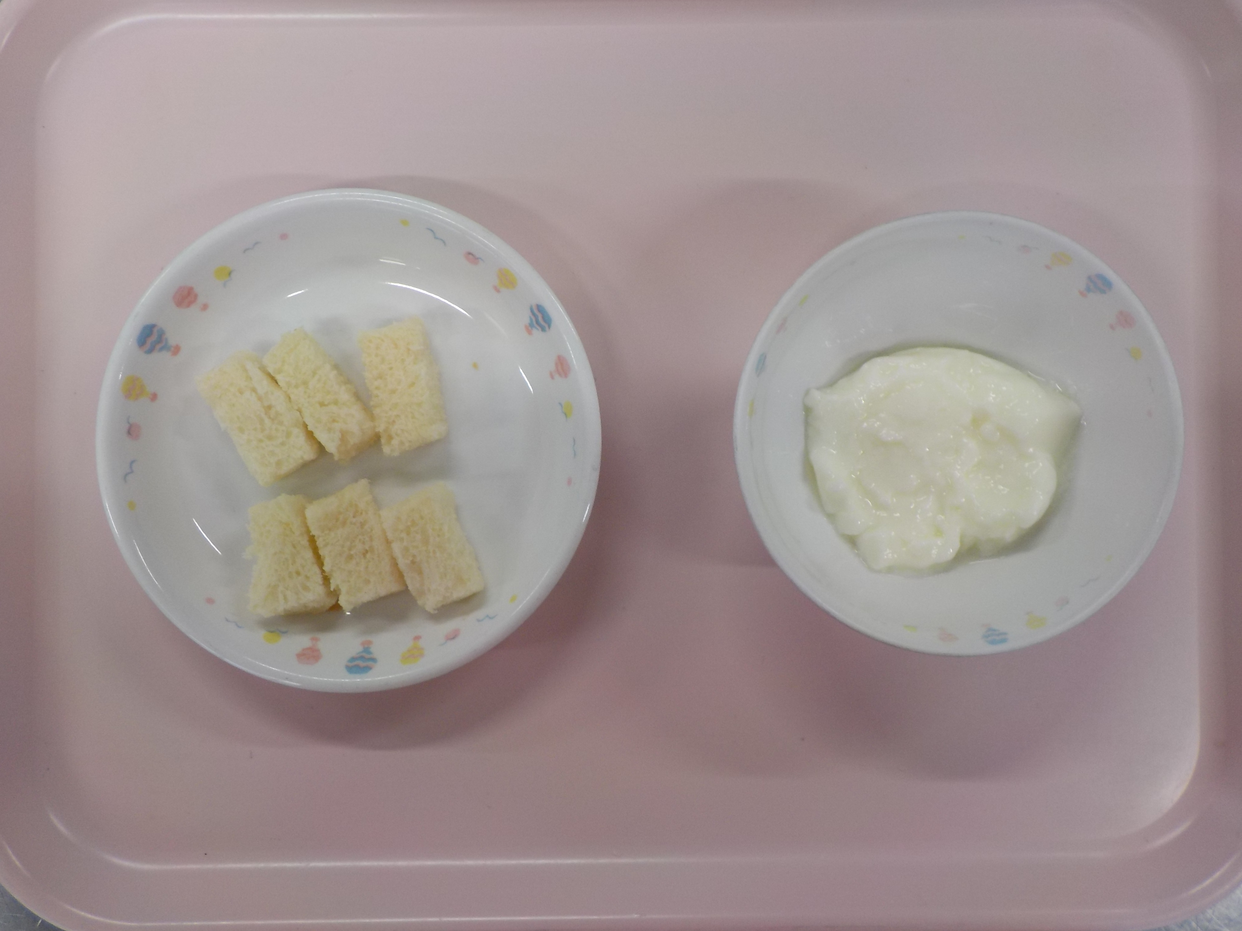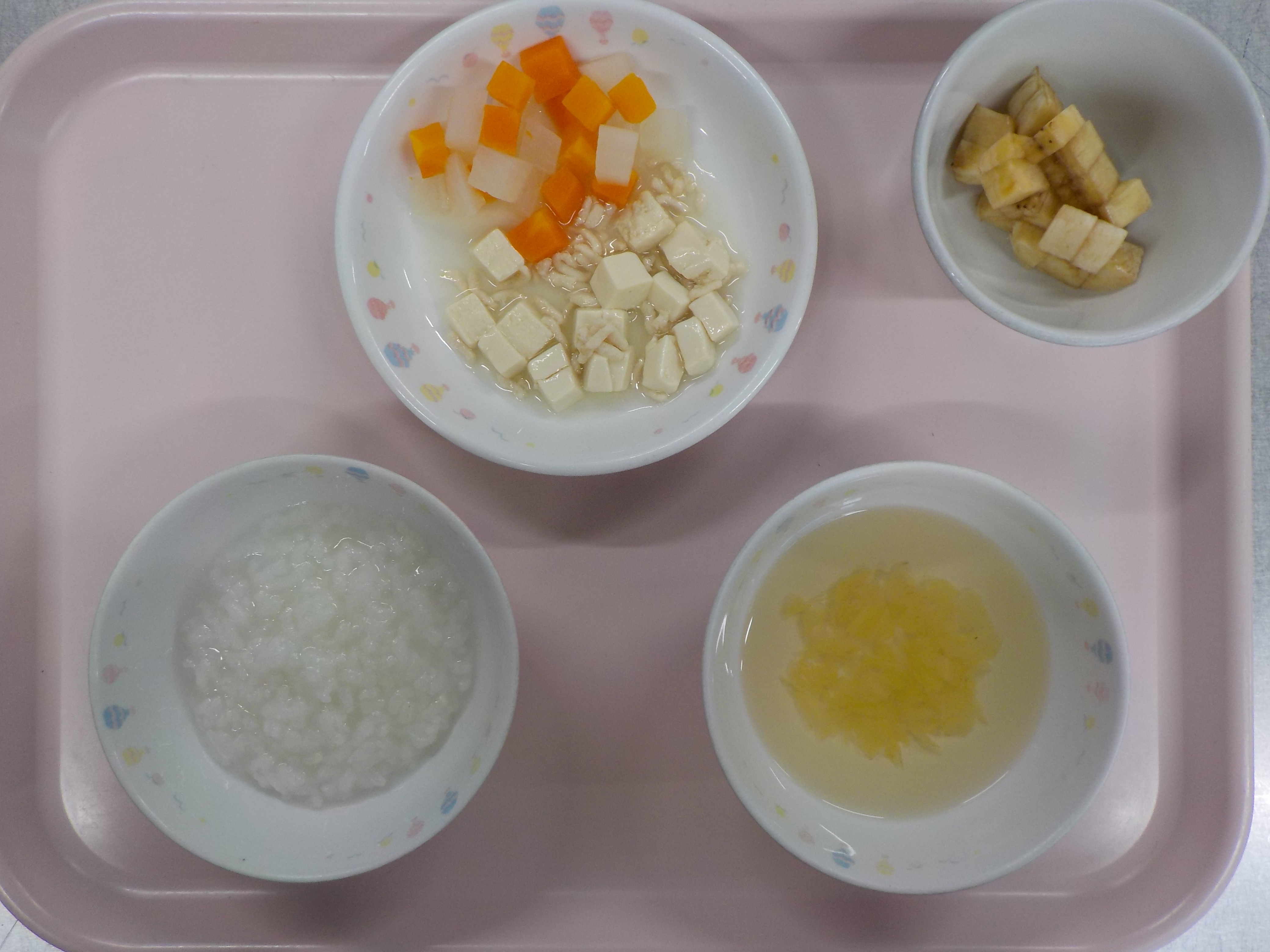 離乳食(中期食)・おかゆ・豆腐のそぼろ煮・人参と大根煮・白菜のすまし汁・バナナ・パン・ヨーグルト