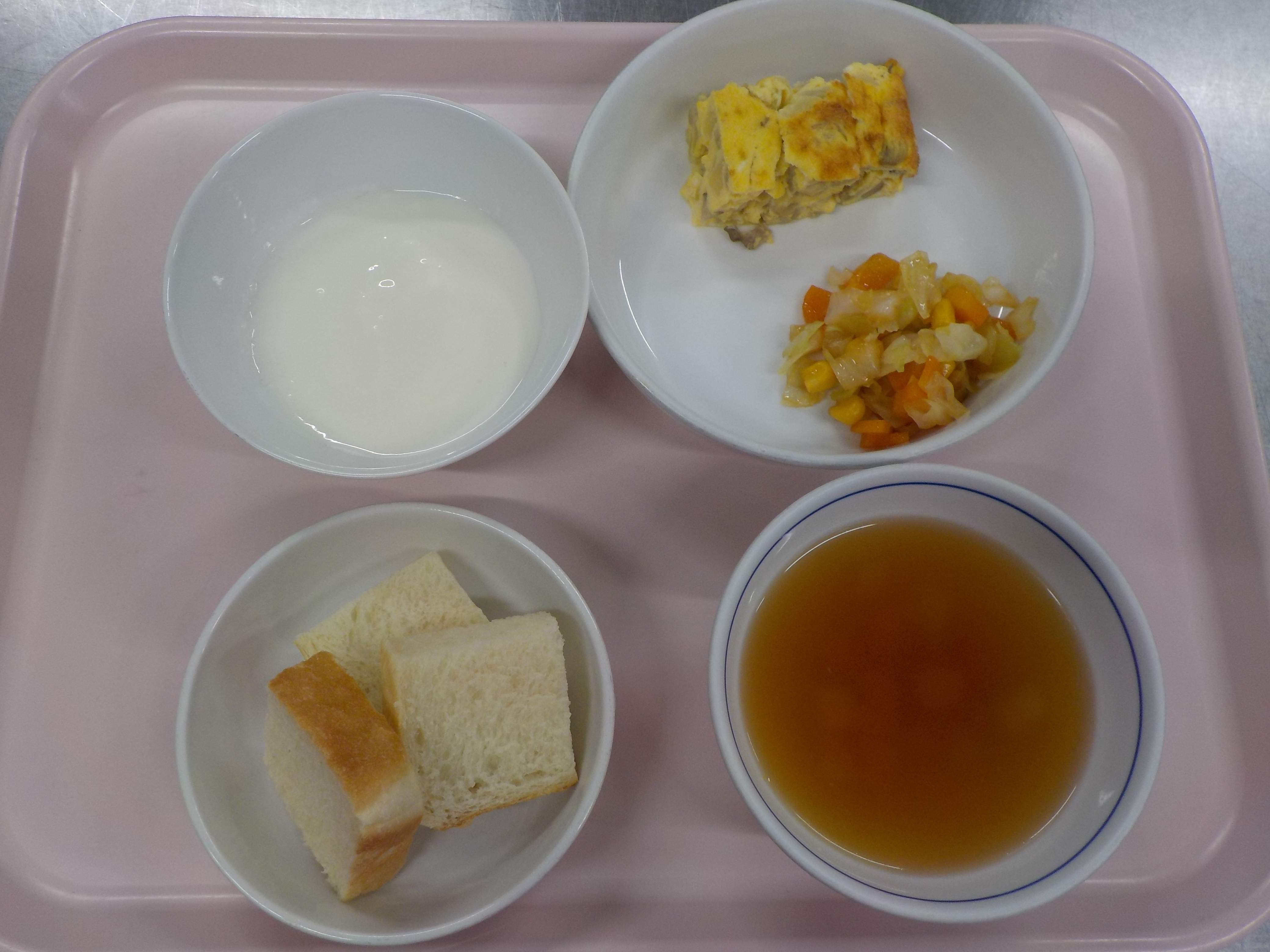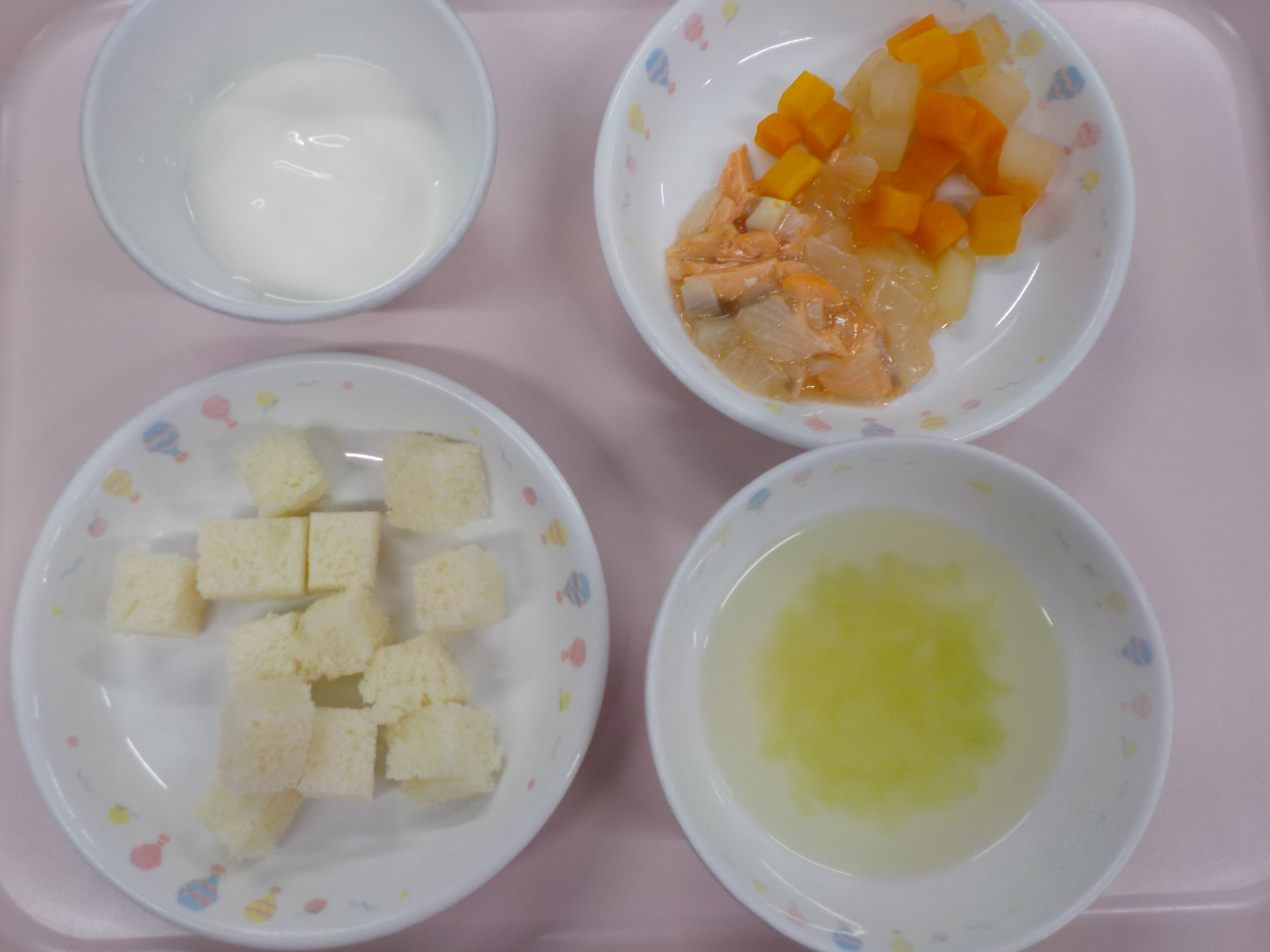 ・パン・鮭と玉ねぎ煮・人参と大根煮・キャベツスープ・ヨーグルト
