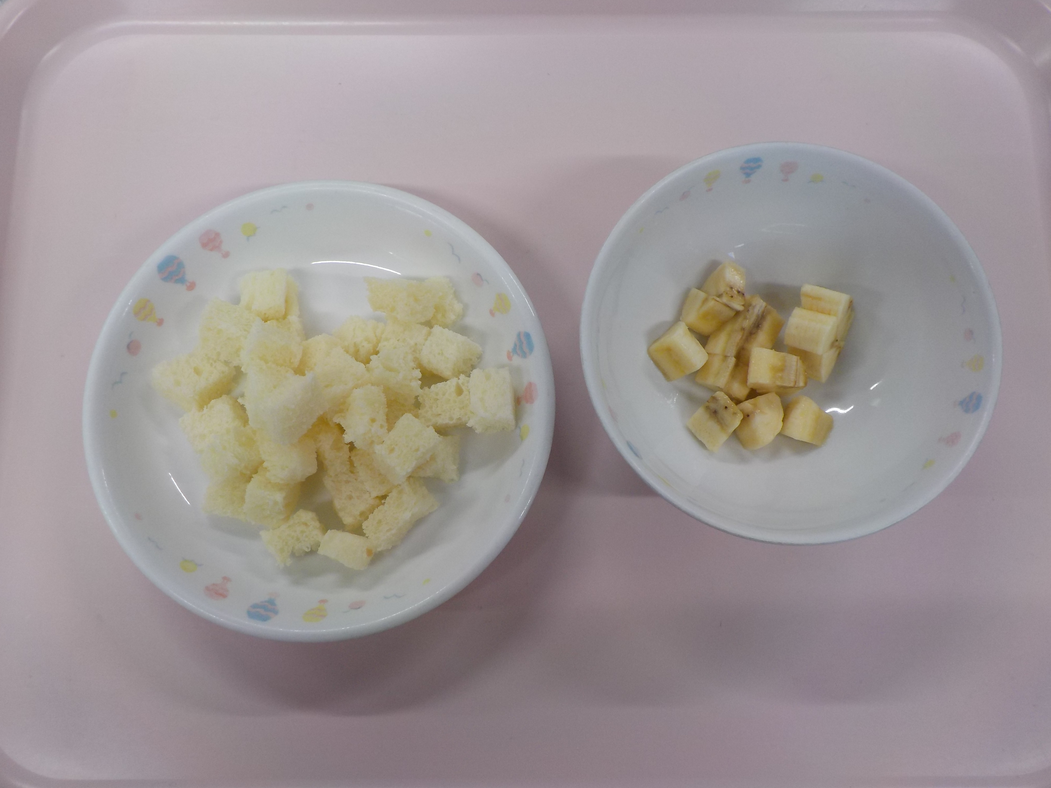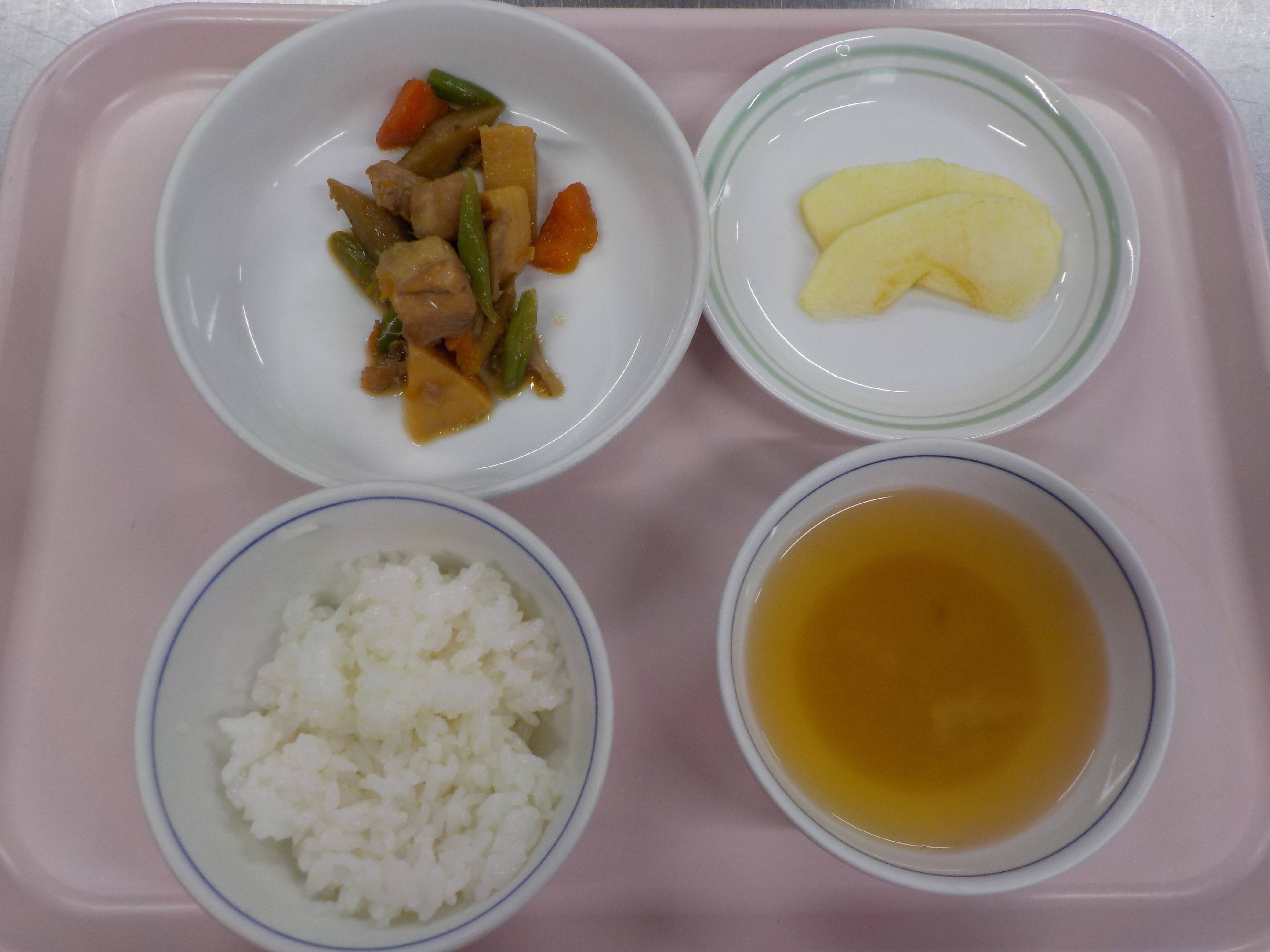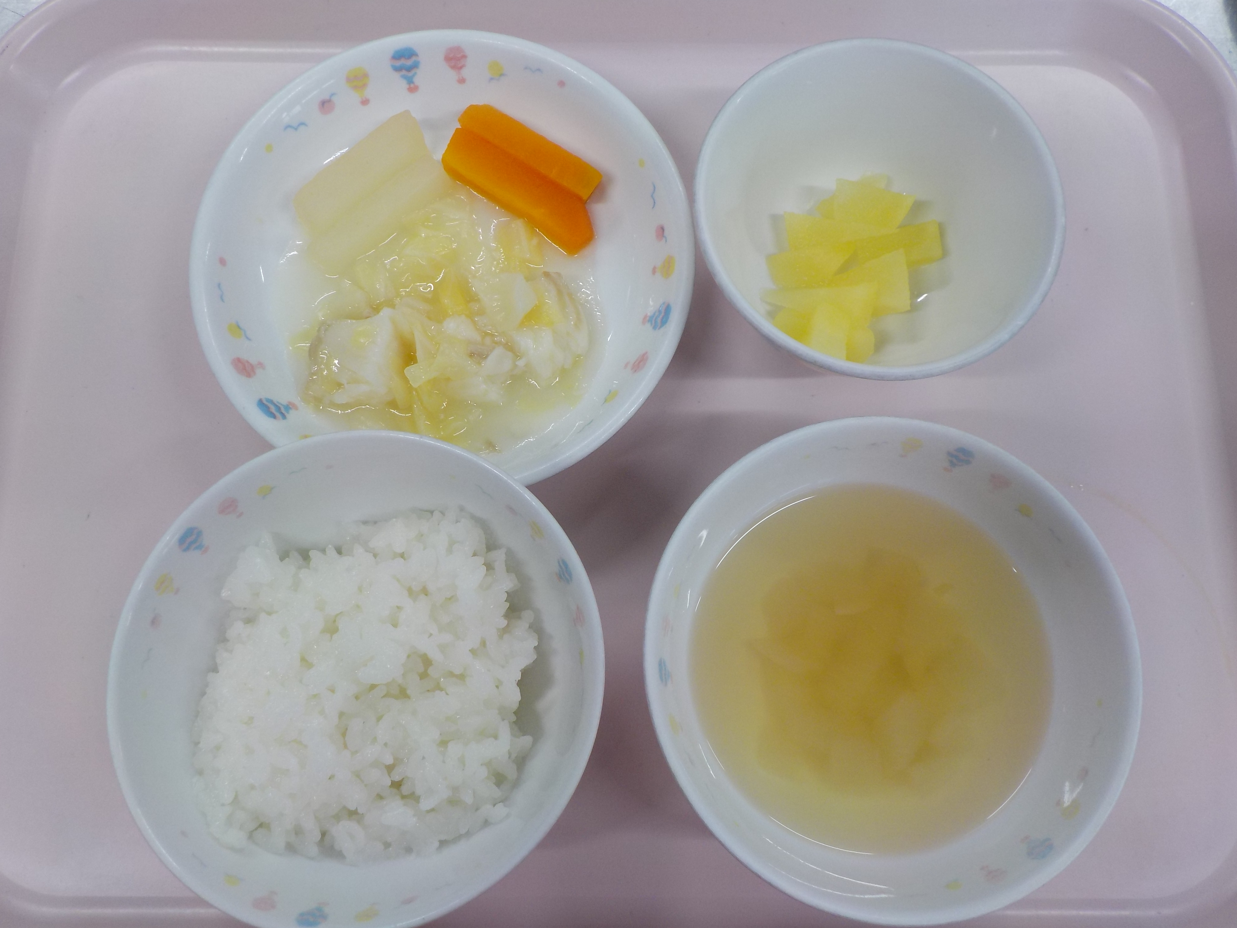 ・ご飯・白身魚と白菜煮・人参と大根煮・玉ねぎの味噌汁・りんご煮