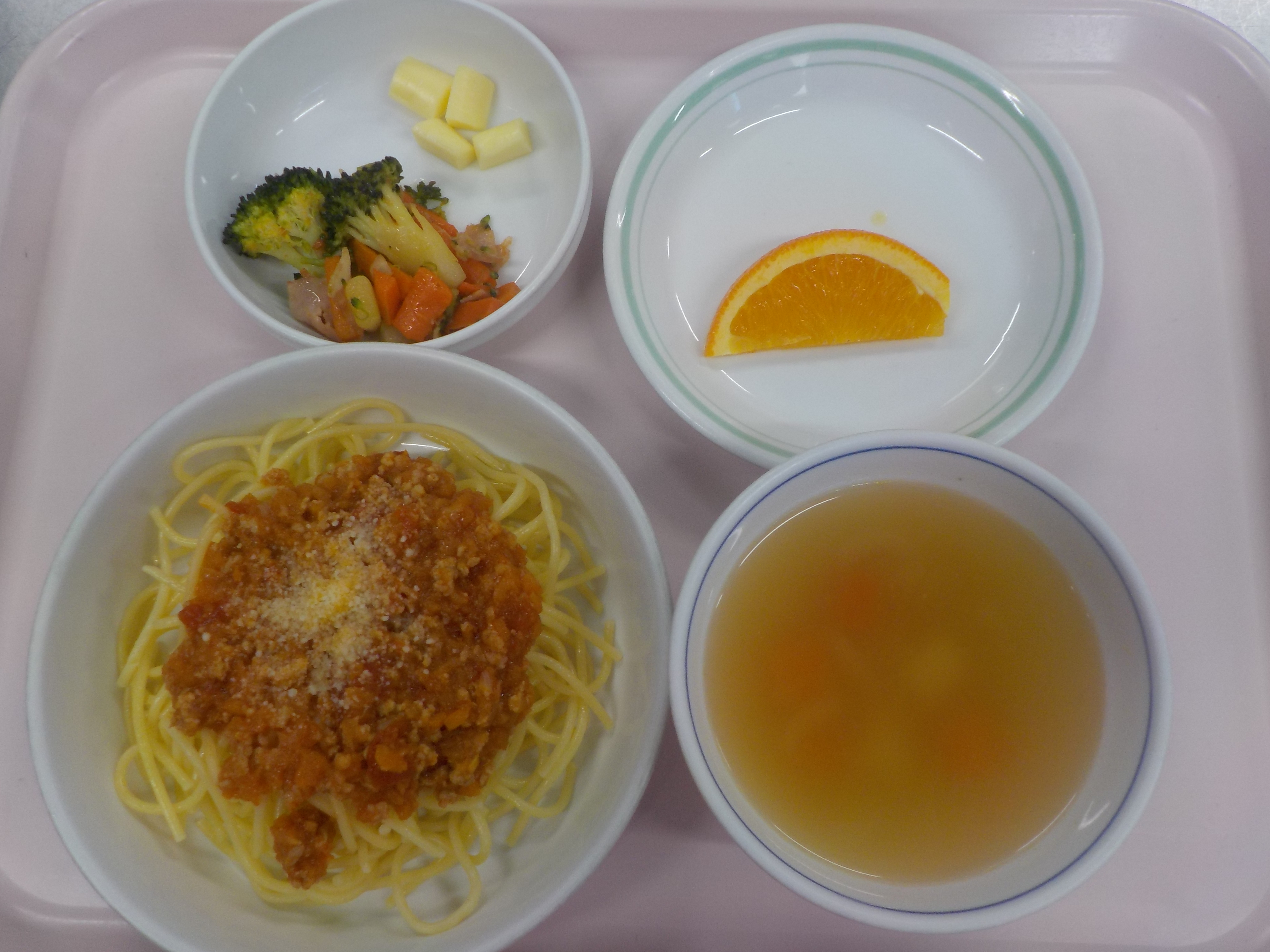 ・ミートソーススパゲッティ・ブロッコリーソテー・チーズ・スープ・オレンジ