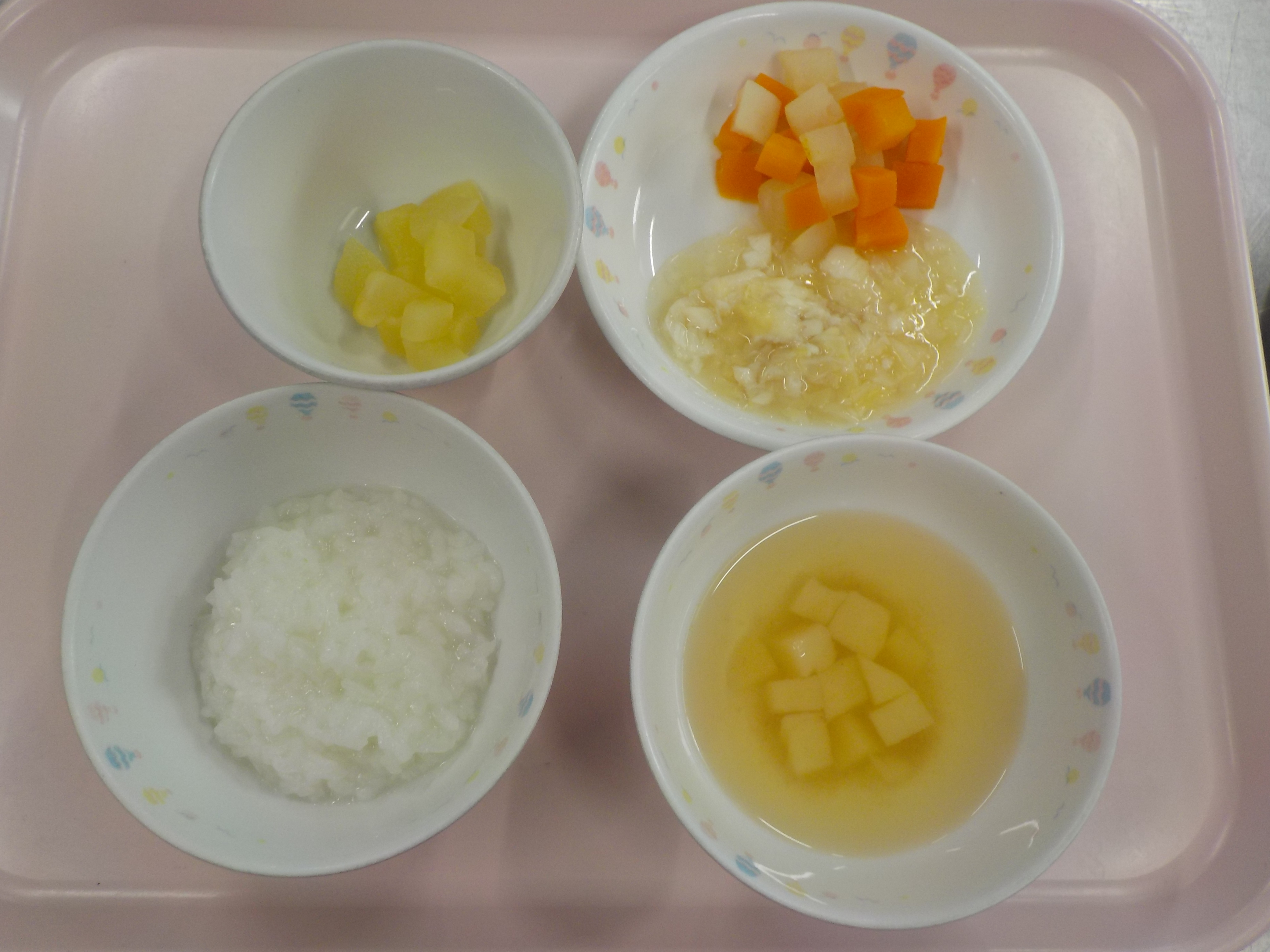 ・おかゆ・白身魚とキャベツ煮・人参とじゃが芋煮・豆腐の味噌汁・りんご煮