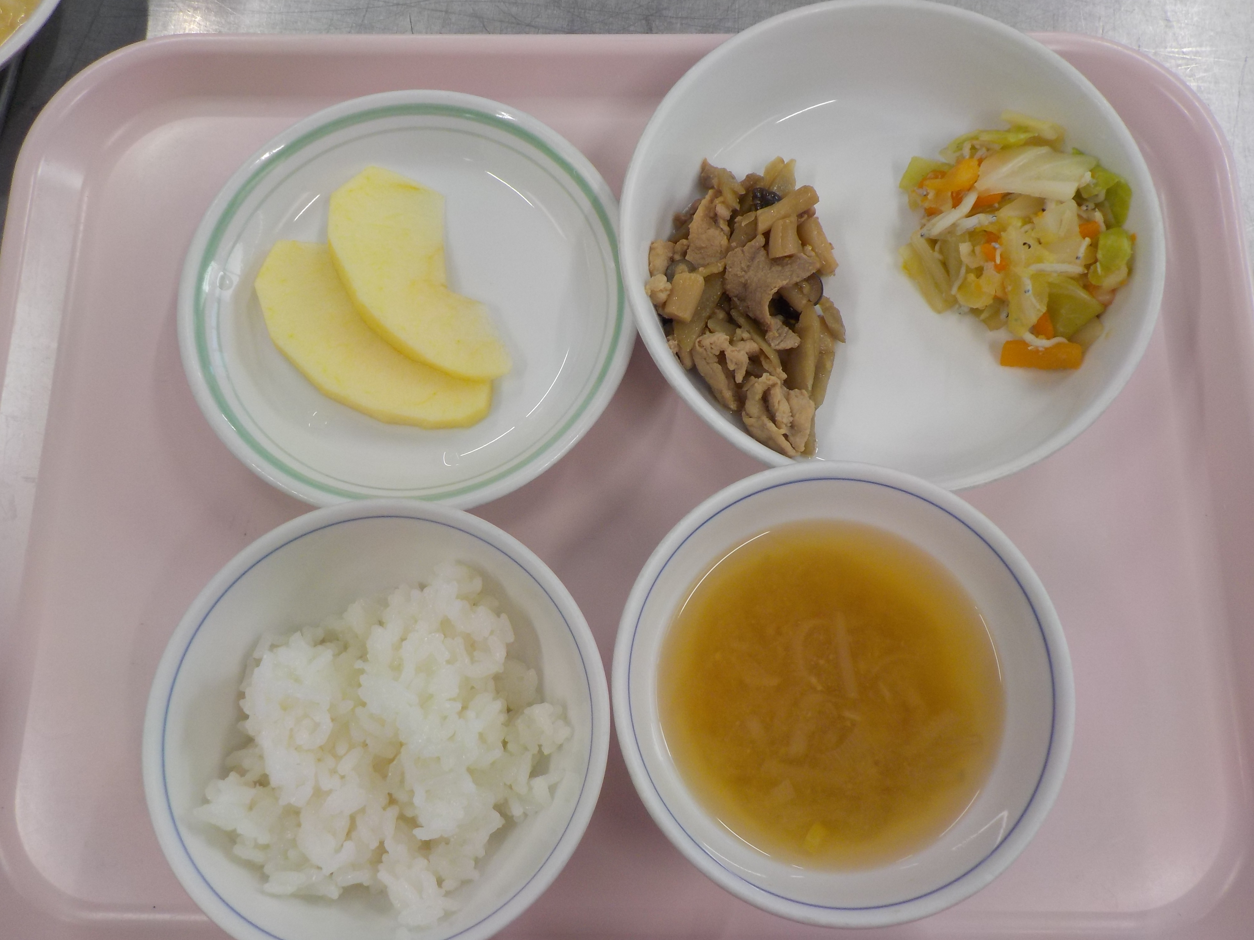 ・ご飯・豚肉のしぐれ煮・しらす和え・味噌汁・りんご