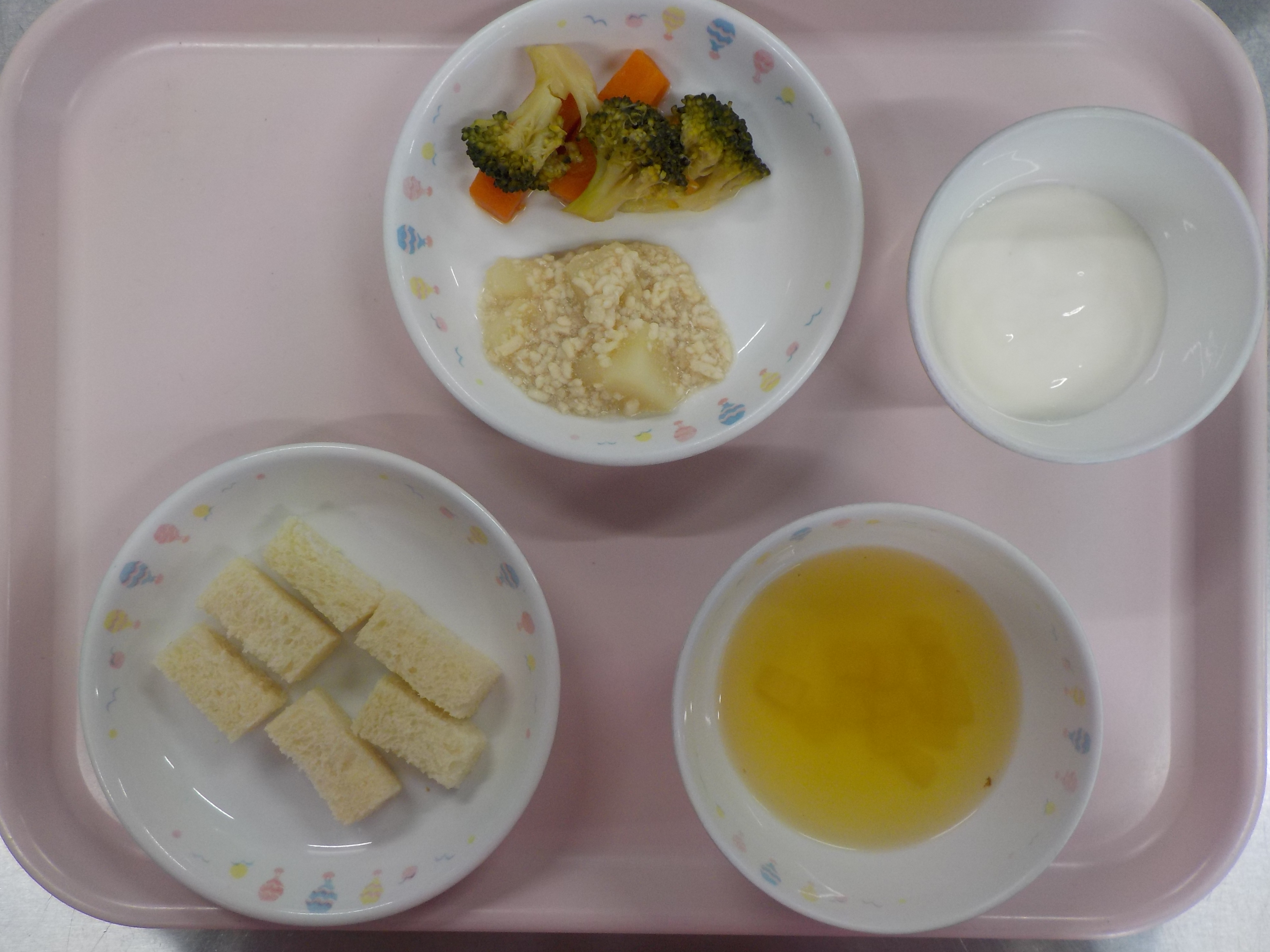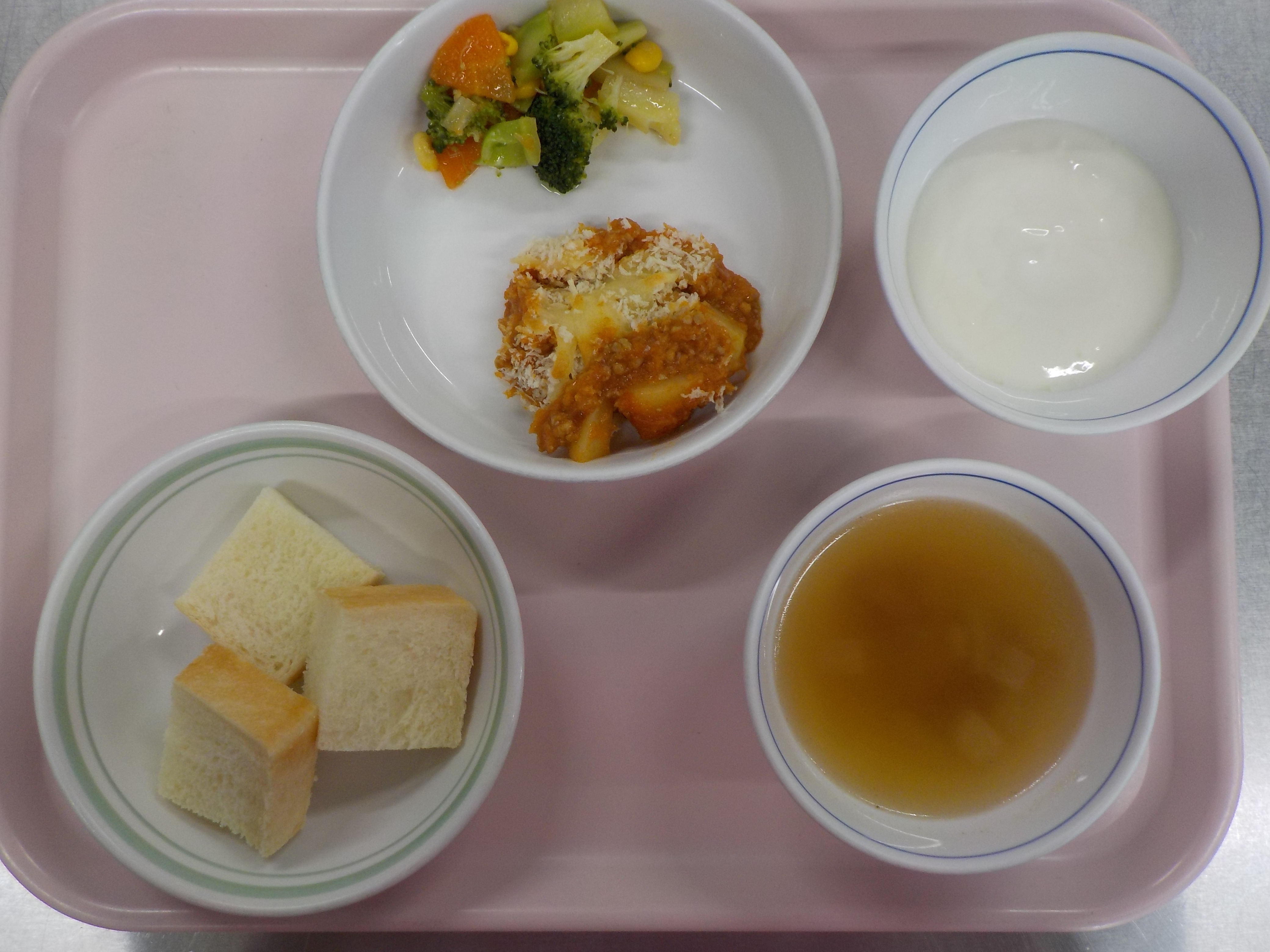 ・パン・じゃが芋のそぼろ煮・人参とブロッコリー煮・玉ねぎのスープ・ヨーグルト