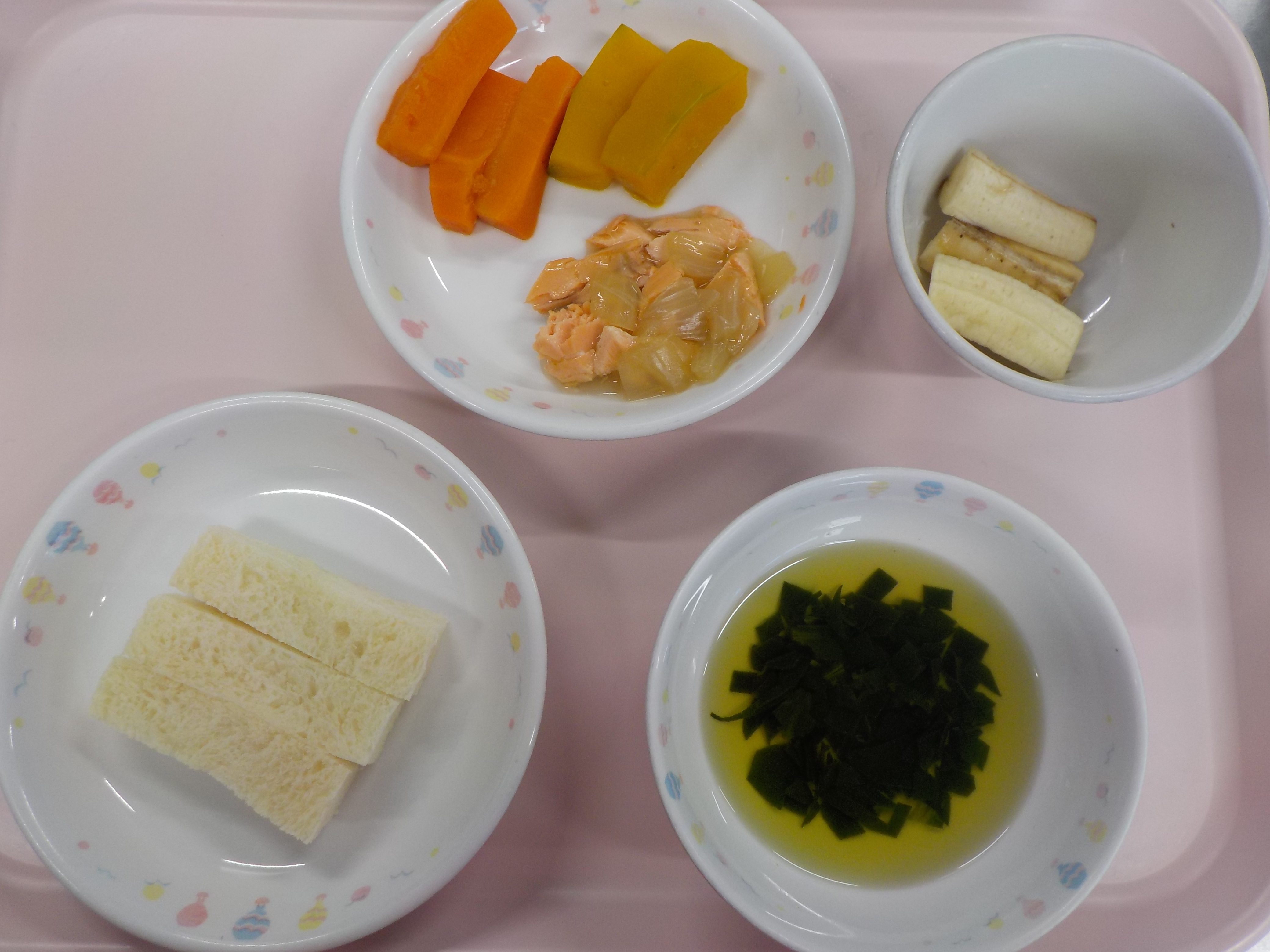 ・パン・鮭と玉ねぎ煮・人参と南瓜煮・ほうれん草のスープ・バナナ