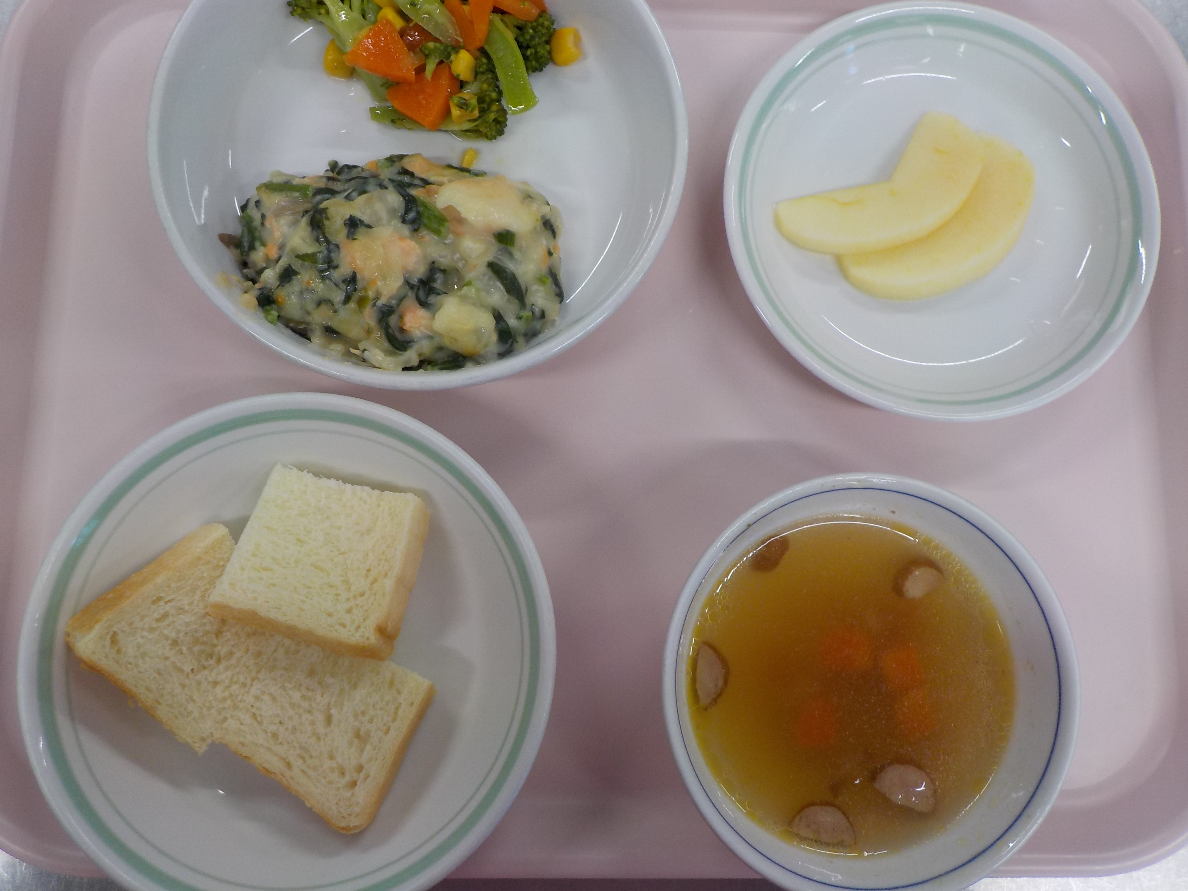 ・パン・鮭とほうれん草のグラタン・花野菜サラダ・スープ・りんご