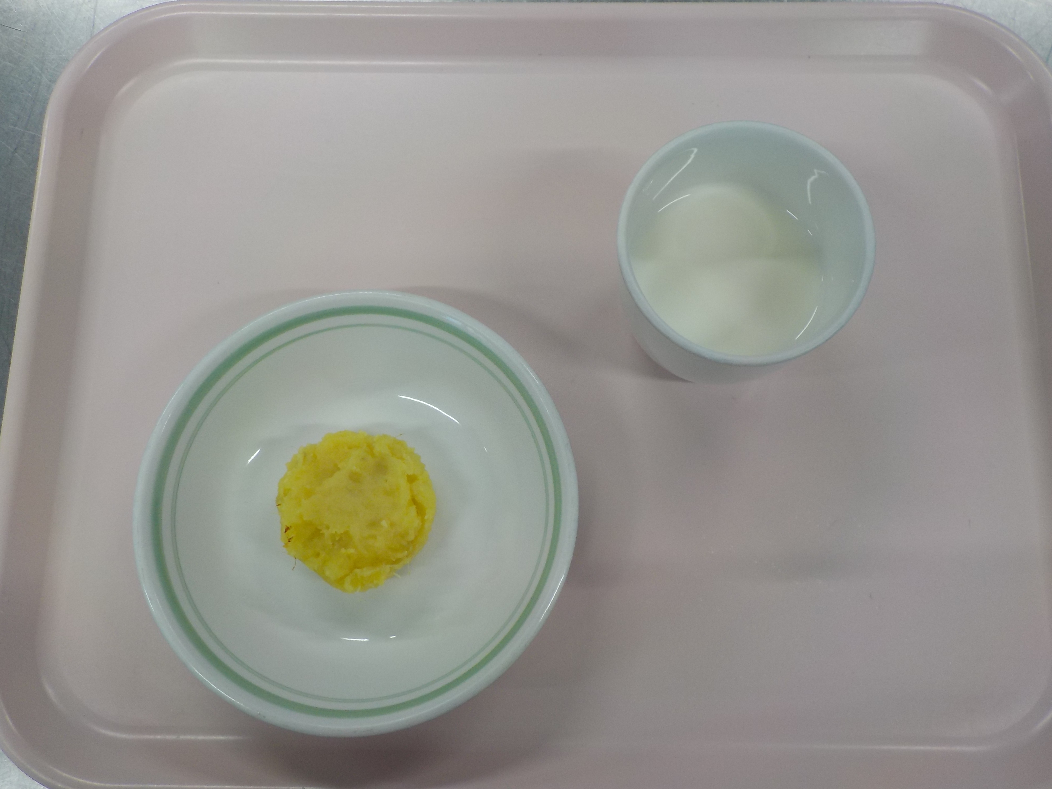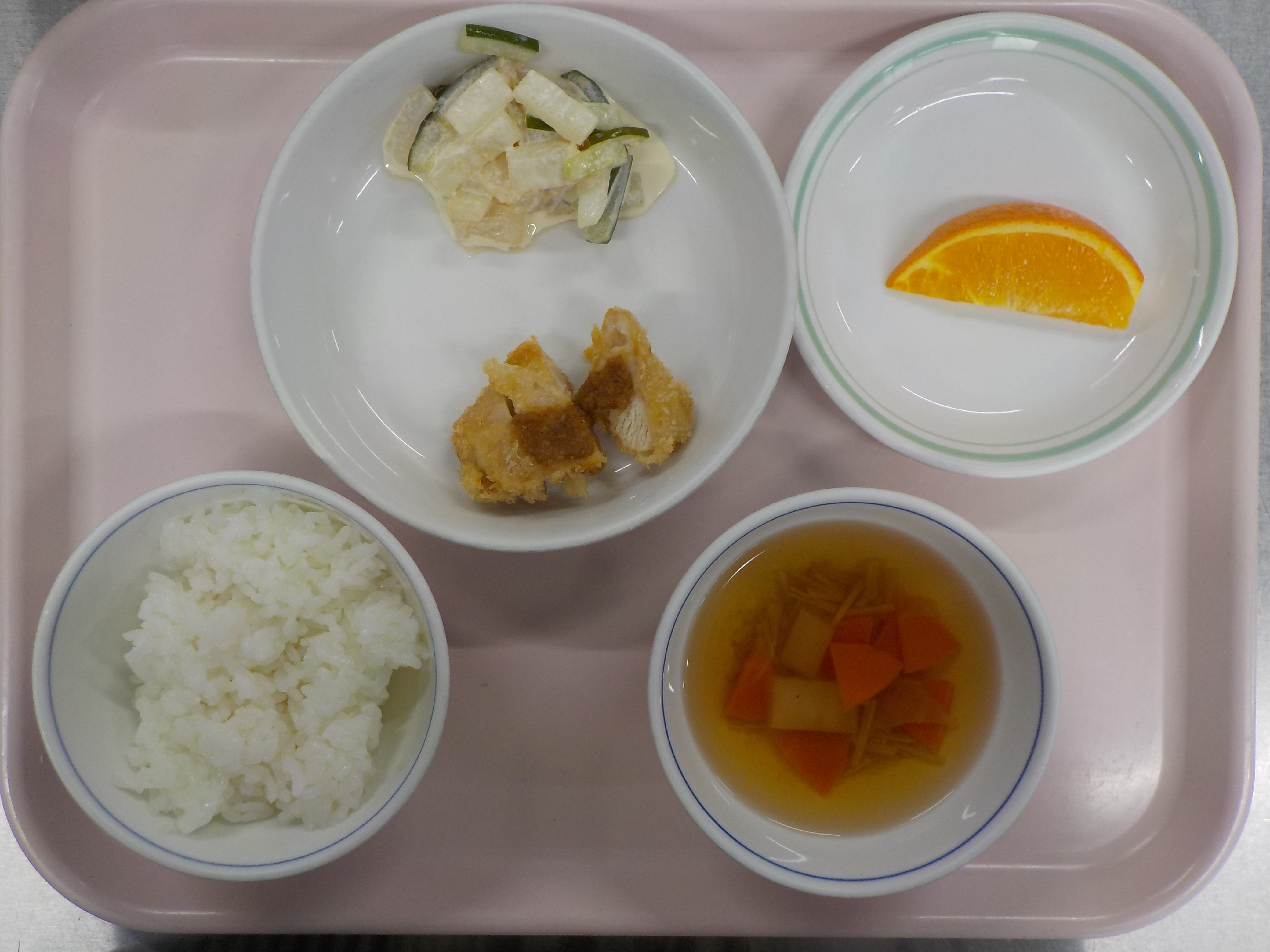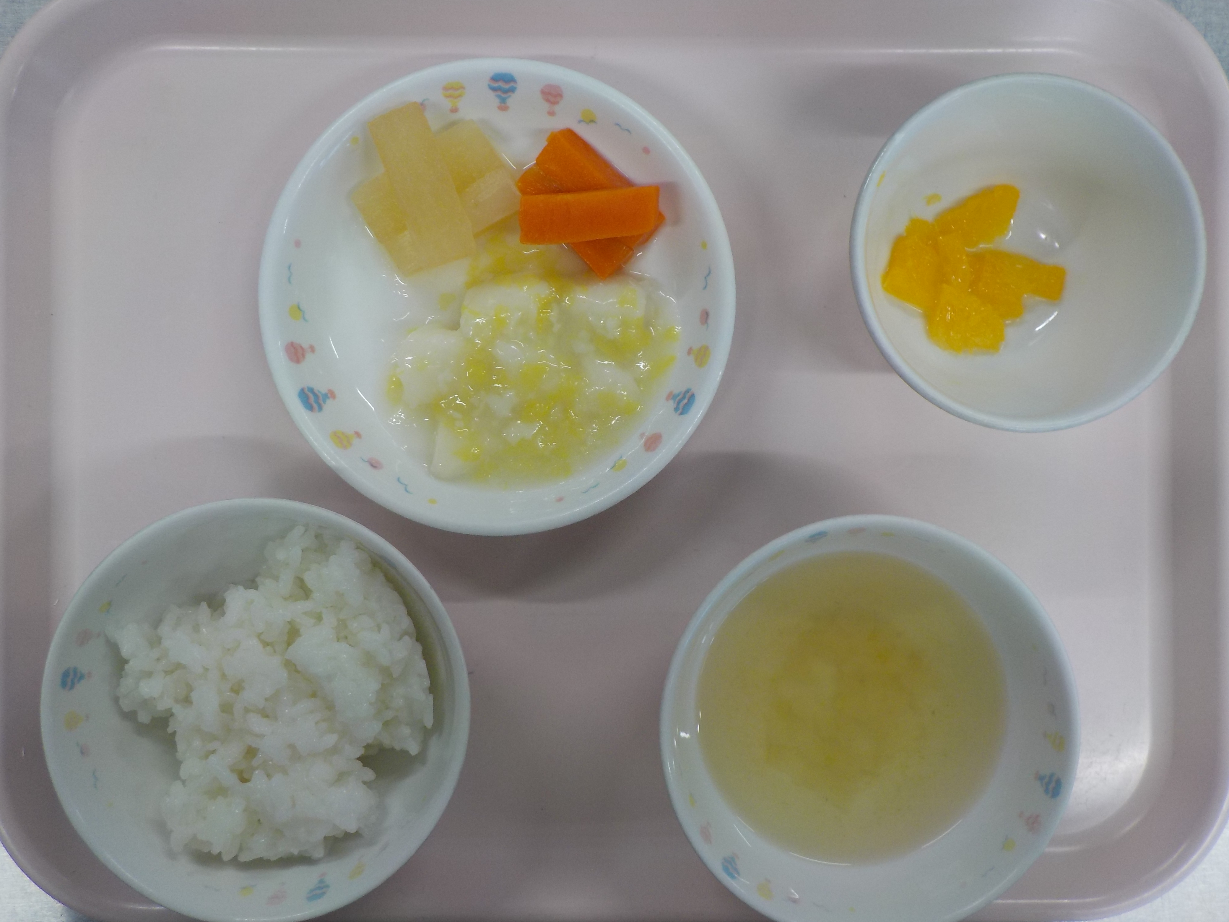 ・ご飯・白身魚と白菜煮・人参と大根煮・玉ねぎのすまし汁・オレンジ