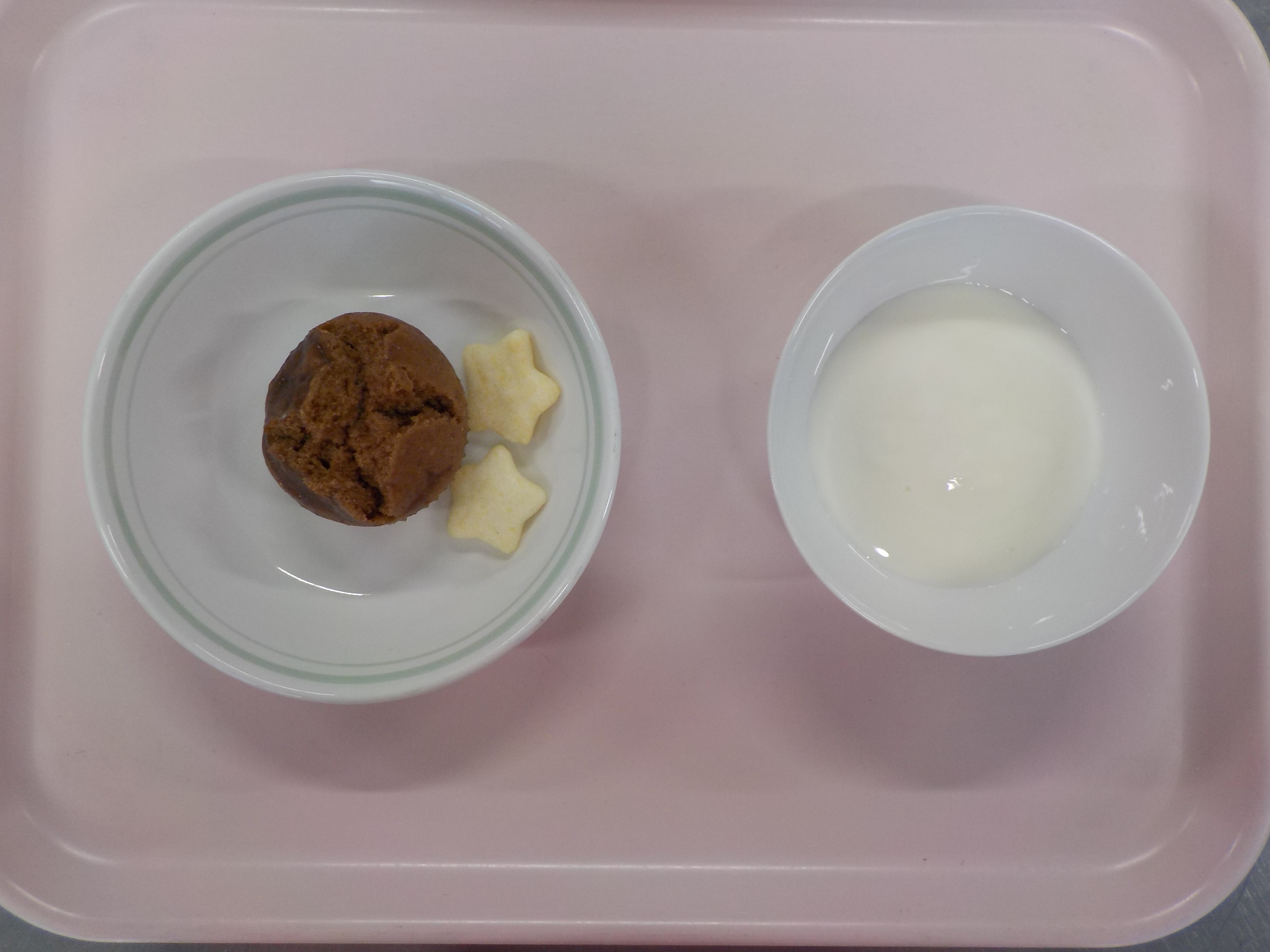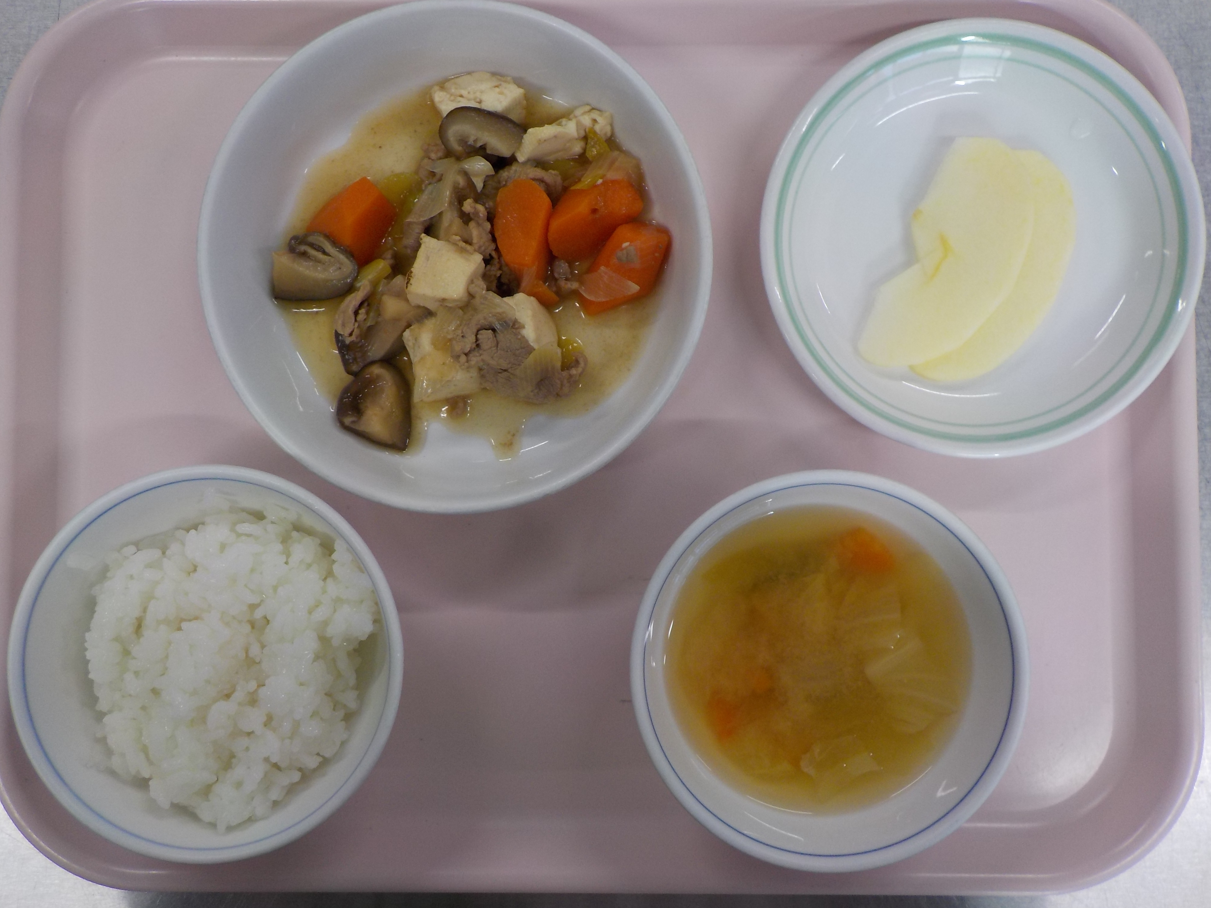 2歳児・ご飯・すき焼き風 具だくさん汁・りんご ・ココア蒸しパン・せんべい・ヨーグルト
