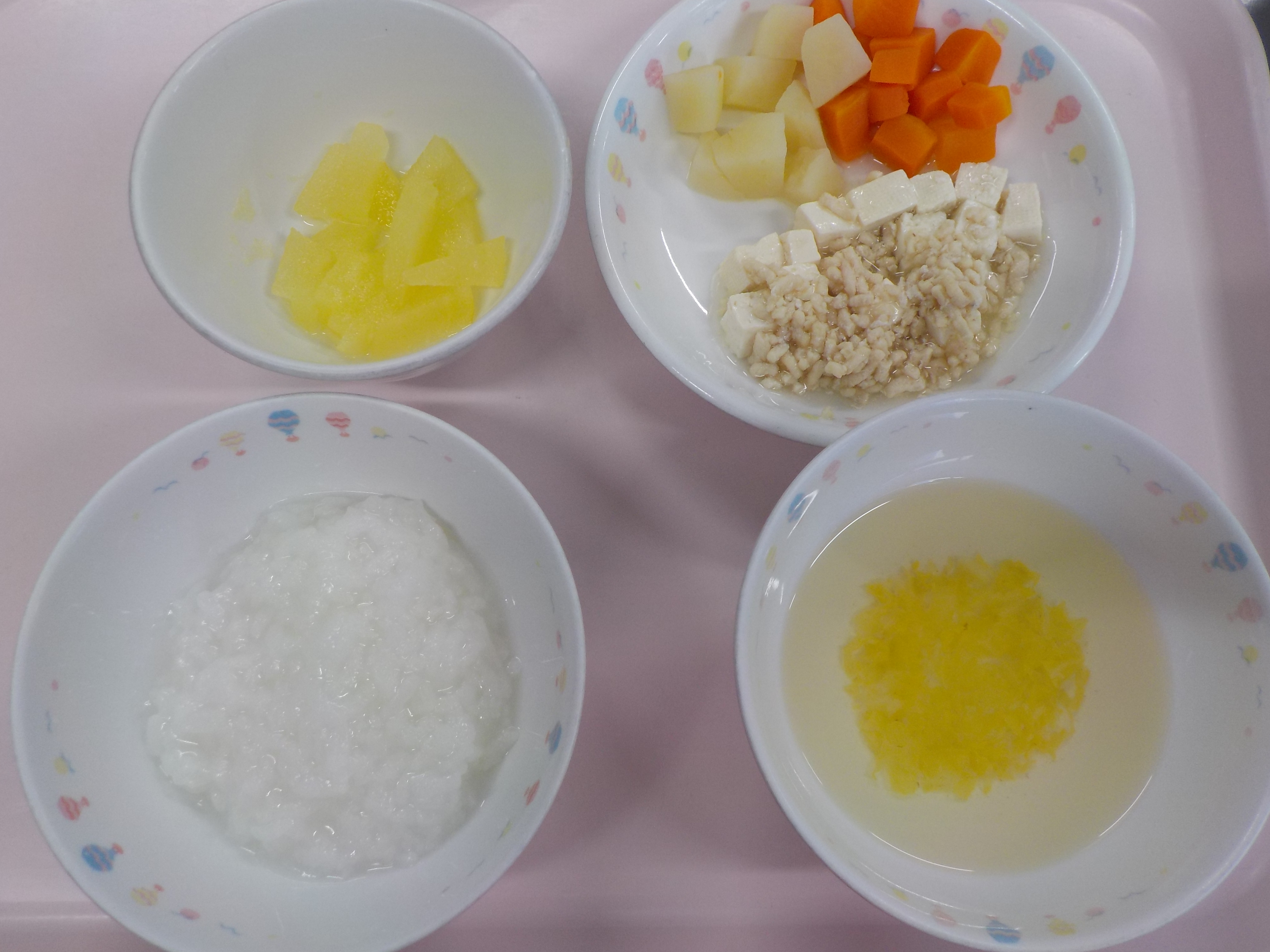 ・おかゆ・豆腐のそぼろ煮・じゃが芋と人参煮・白菜のすまし汁・りんご煮
