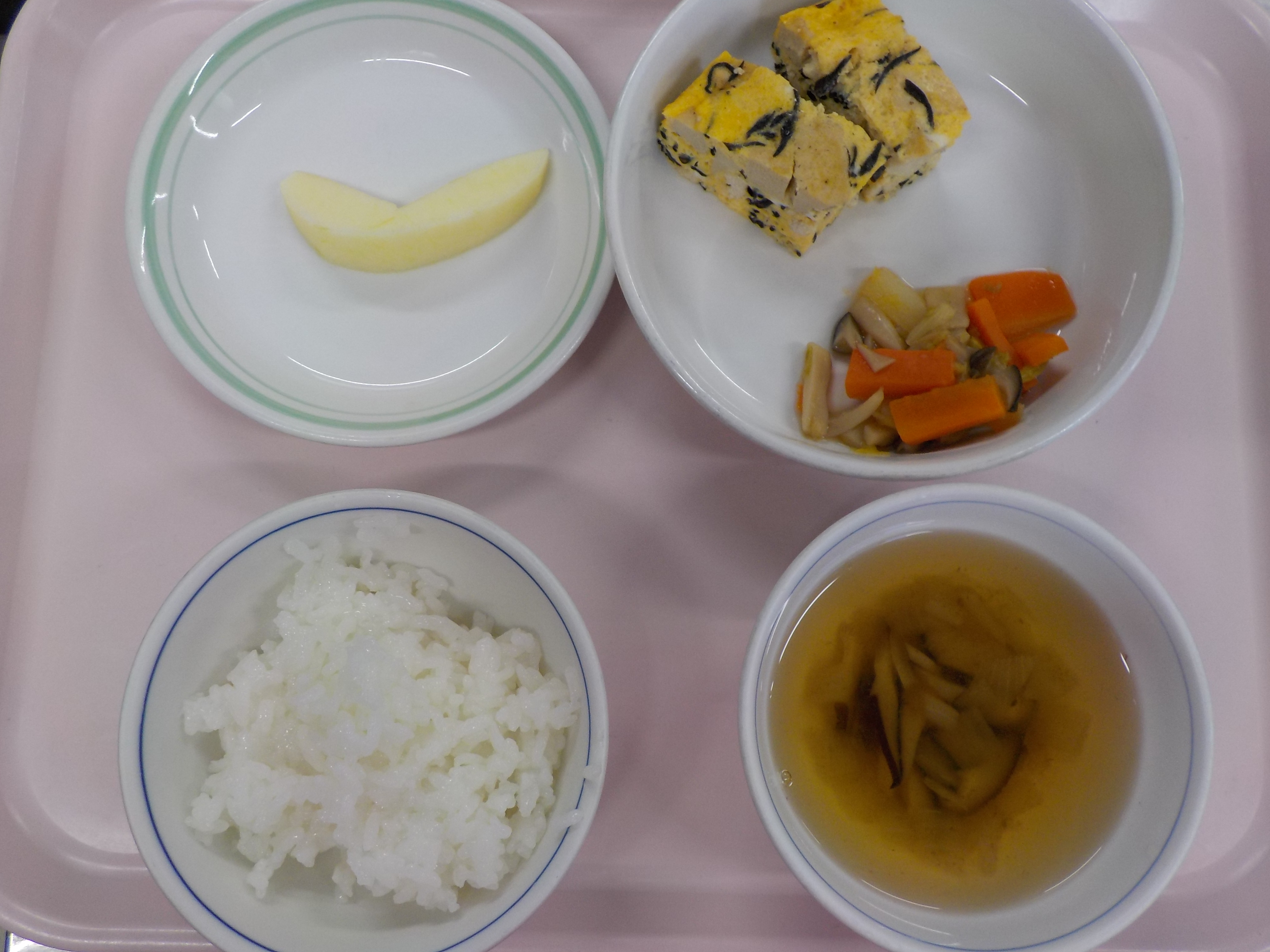 ・ご飯・ひじき入り卵焼き・和え物・すまし汁・りんご