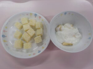 2歳児・ご飯・鶏肉の中華炒め・胡瓜と大根漬け・スープ・りんご・コーンフレークおこし・牛乳