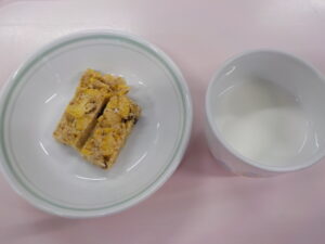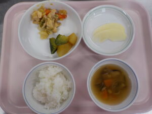 2歳児・ご飯・鶏肉の中華炒め・胡瓜と大根漬け・スープ・りんご・コーンフレークおこし・牛乳