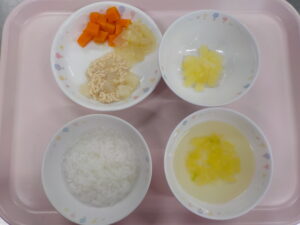 離乳食(中期食)・おかゆ・大根のそぼろ煮・人参と玉ねぎ煮・白菜のすまし汁・りんご煮
