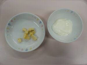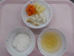 ・おかゆ・白身魚と玉ねぎ煮・人参とじゃが芋煮・きゃべつの味噌汁