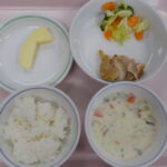 ・ご飯・コンソメガーリックチキン・フレンチサラダ・カブチャウダー・りんご