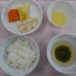 ・ご飯・豆腐のそぼろ煮・人参とじゃが芋煮・ほうれん草の味噌汁・りんご煮