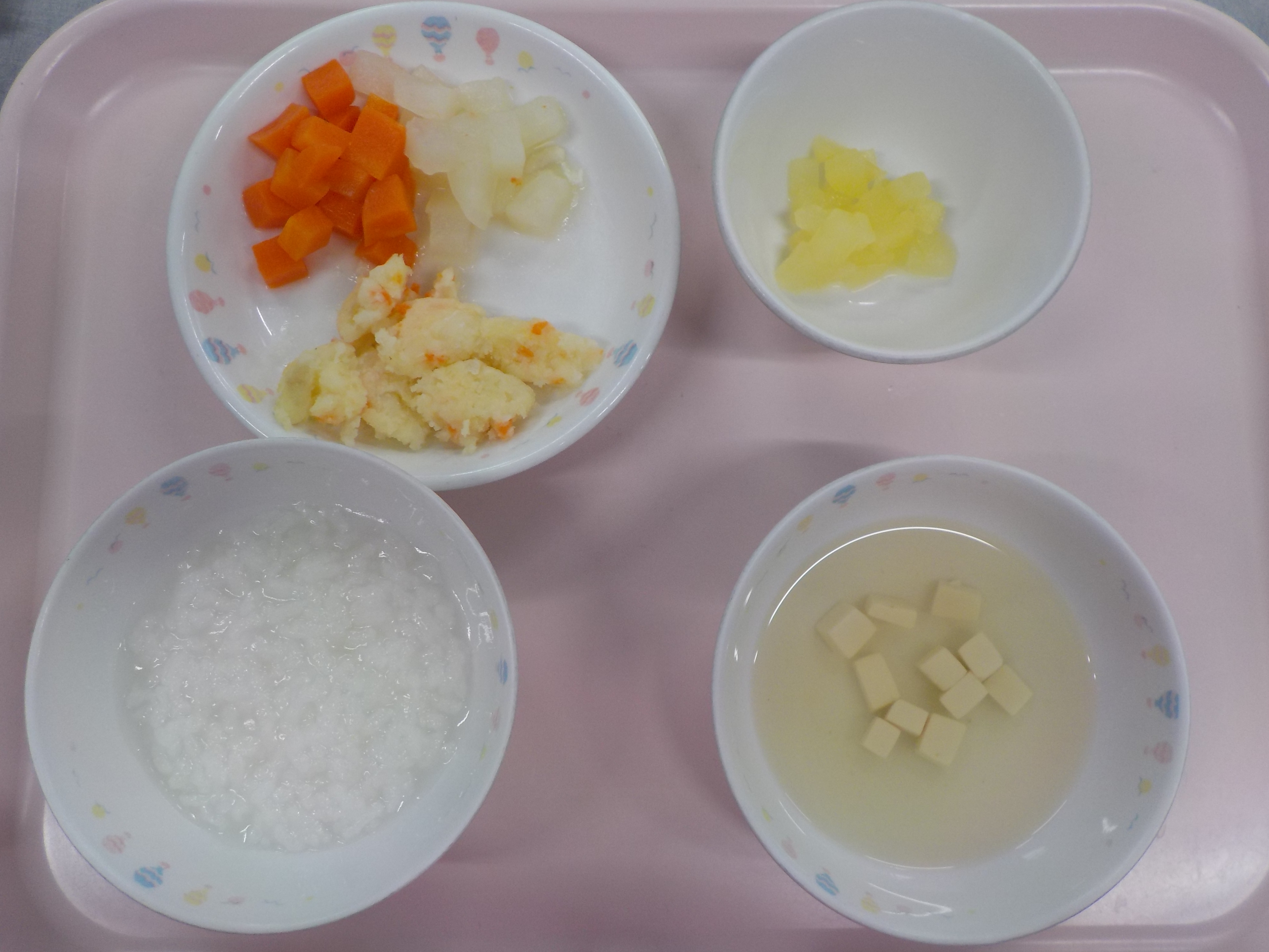 ・おかゆ・じゃが芋のそぼろ煮・人参と大根煮・豆腐のすまし汁・りんご
