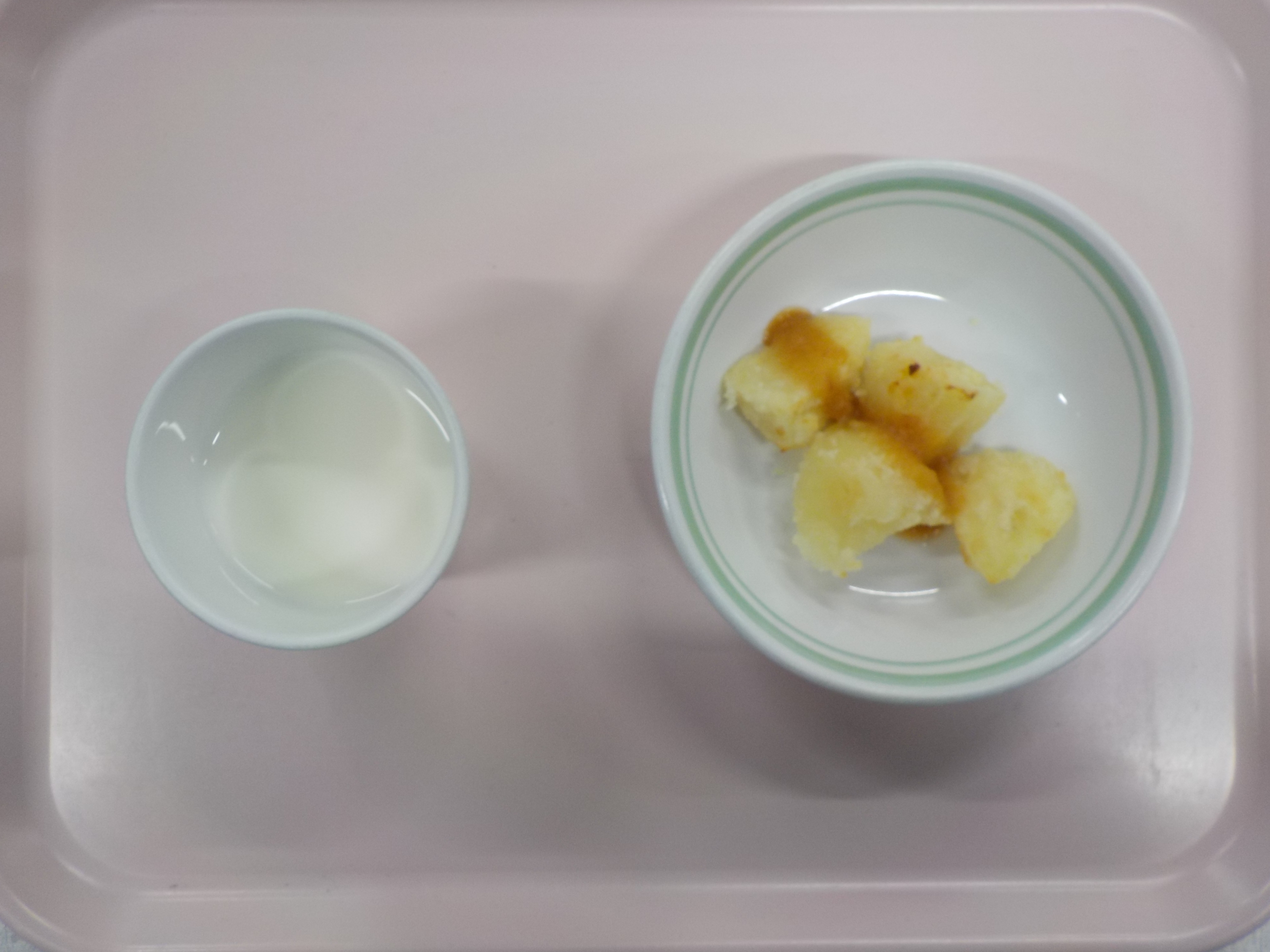 2歳児 ・ご飯・ゼリーフライ・キャベツソテー・けんちん汁・りんご・揚げない味噌ポテト・牛乳