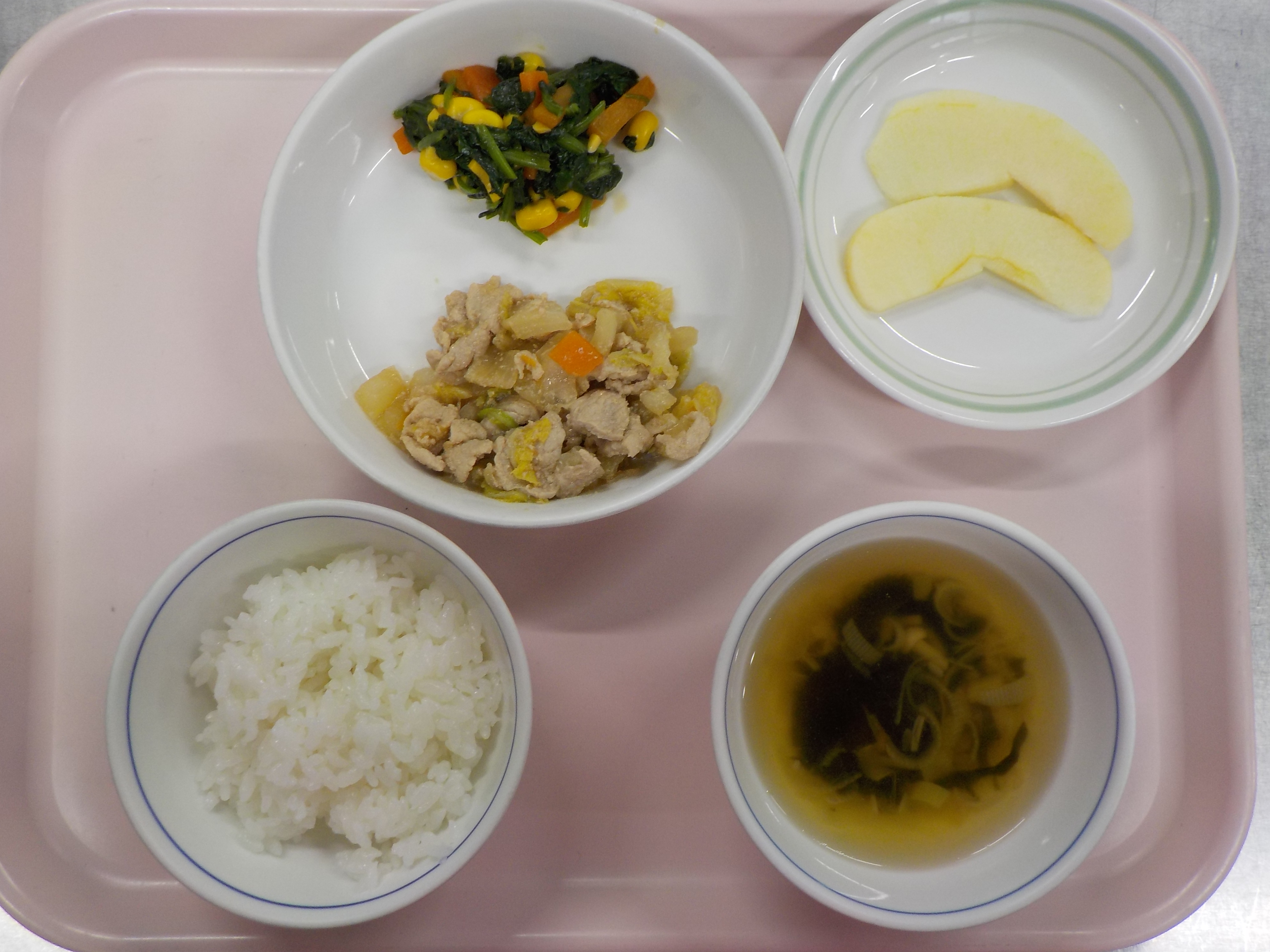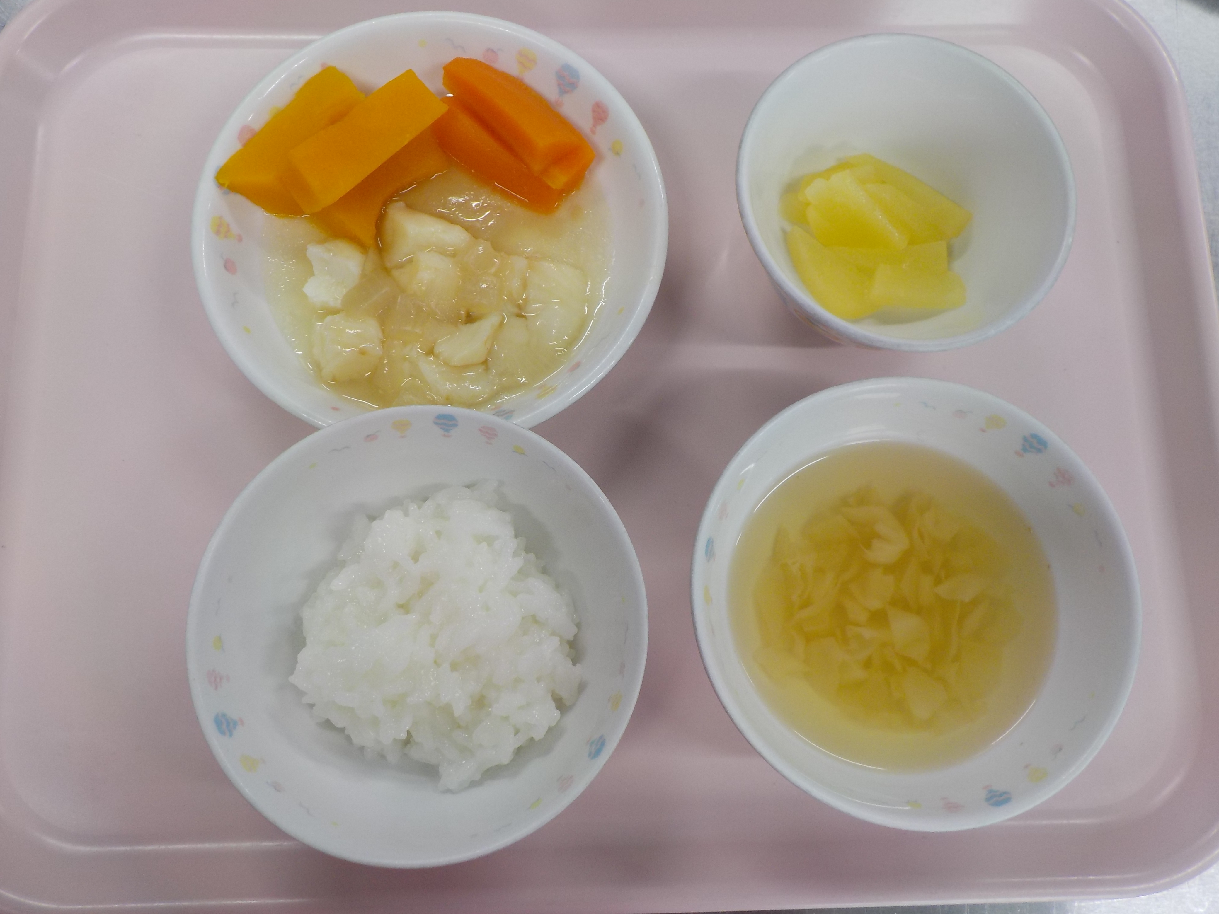 ・ご飯・白身魚と玉ねぎ煮・人参と南瓜煮・キャベツスープ・りんご煮