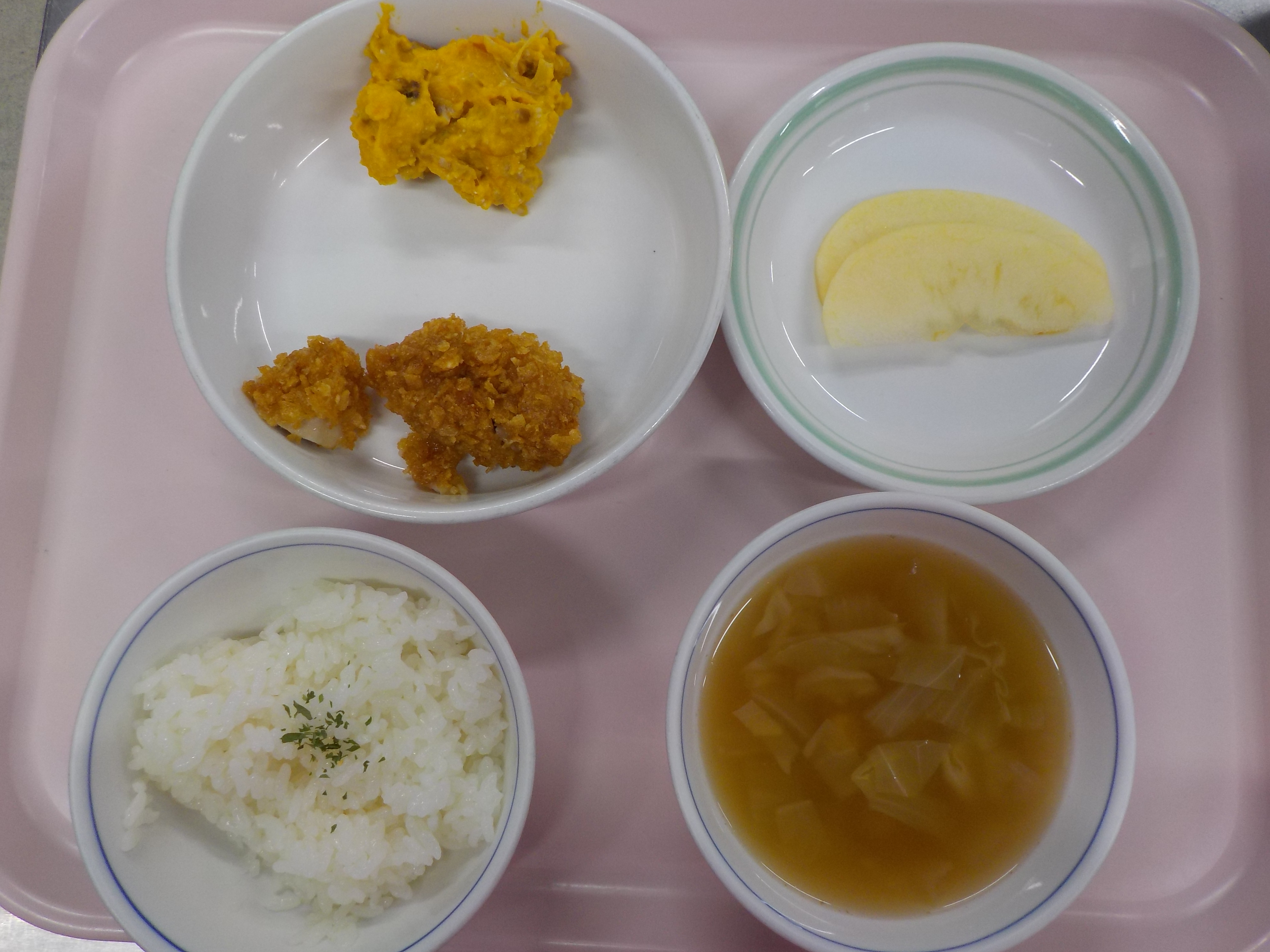 ・バターライス・チキンのコーンフレーク揚げ・南瓜サラダ・スープ・りんご