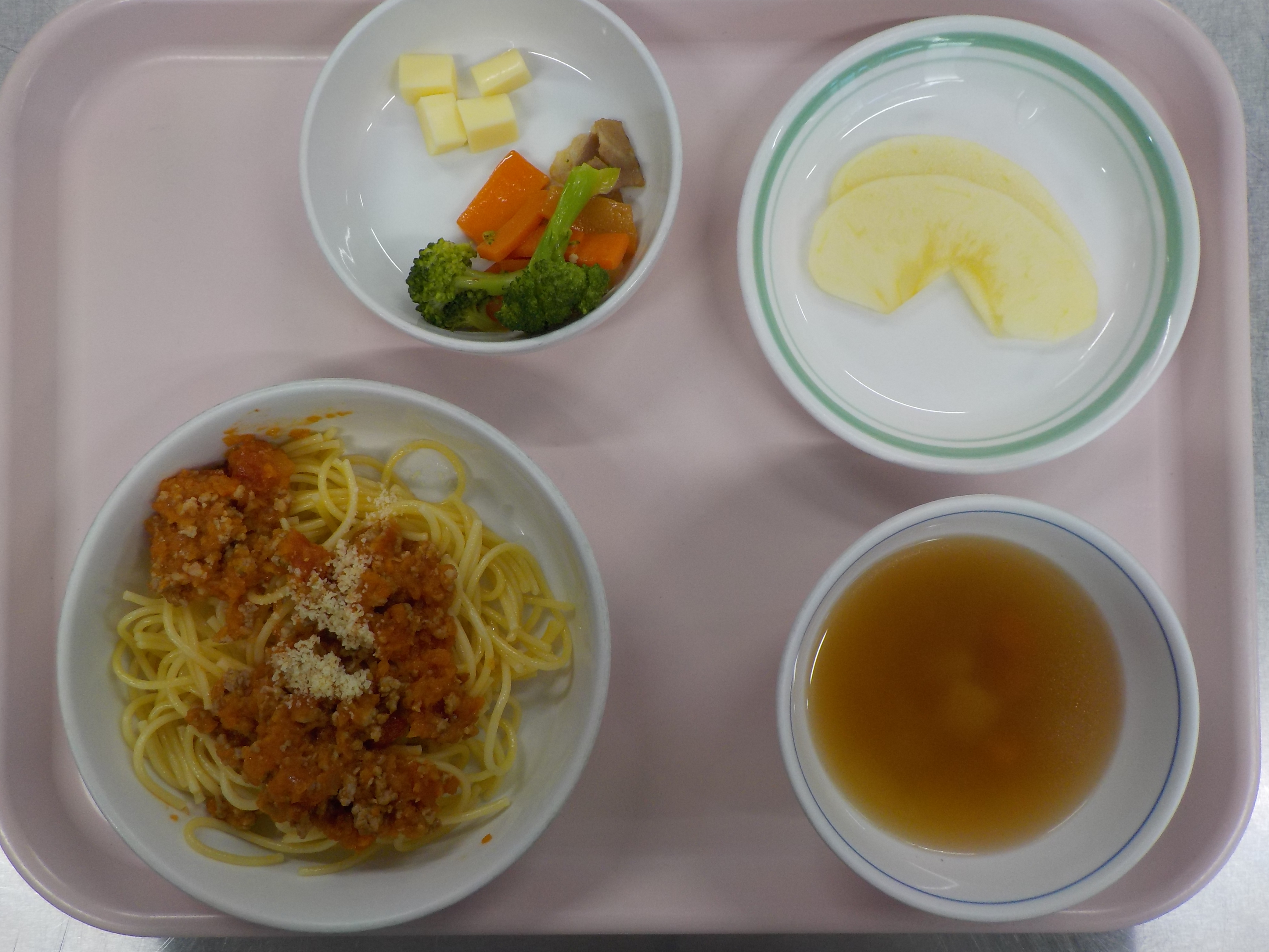 ・ミートソーススパゲッティ・ブロッコリーソテー・チーズ・スープ・りんご