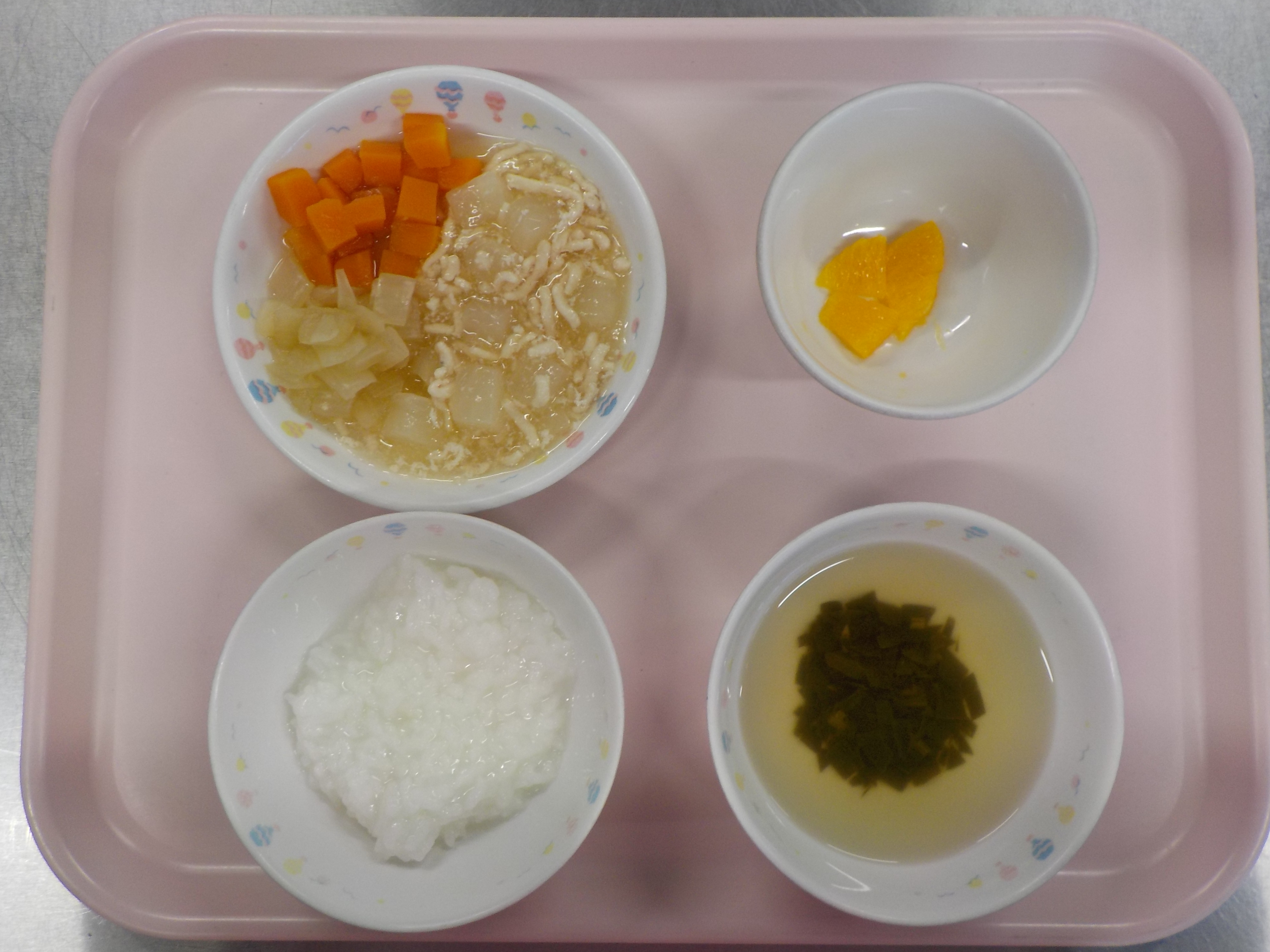 ・おかゆ・大根のそぼろ煮・人参と玉ねぎ煮・ほうれん草すまし汁・オレンジ