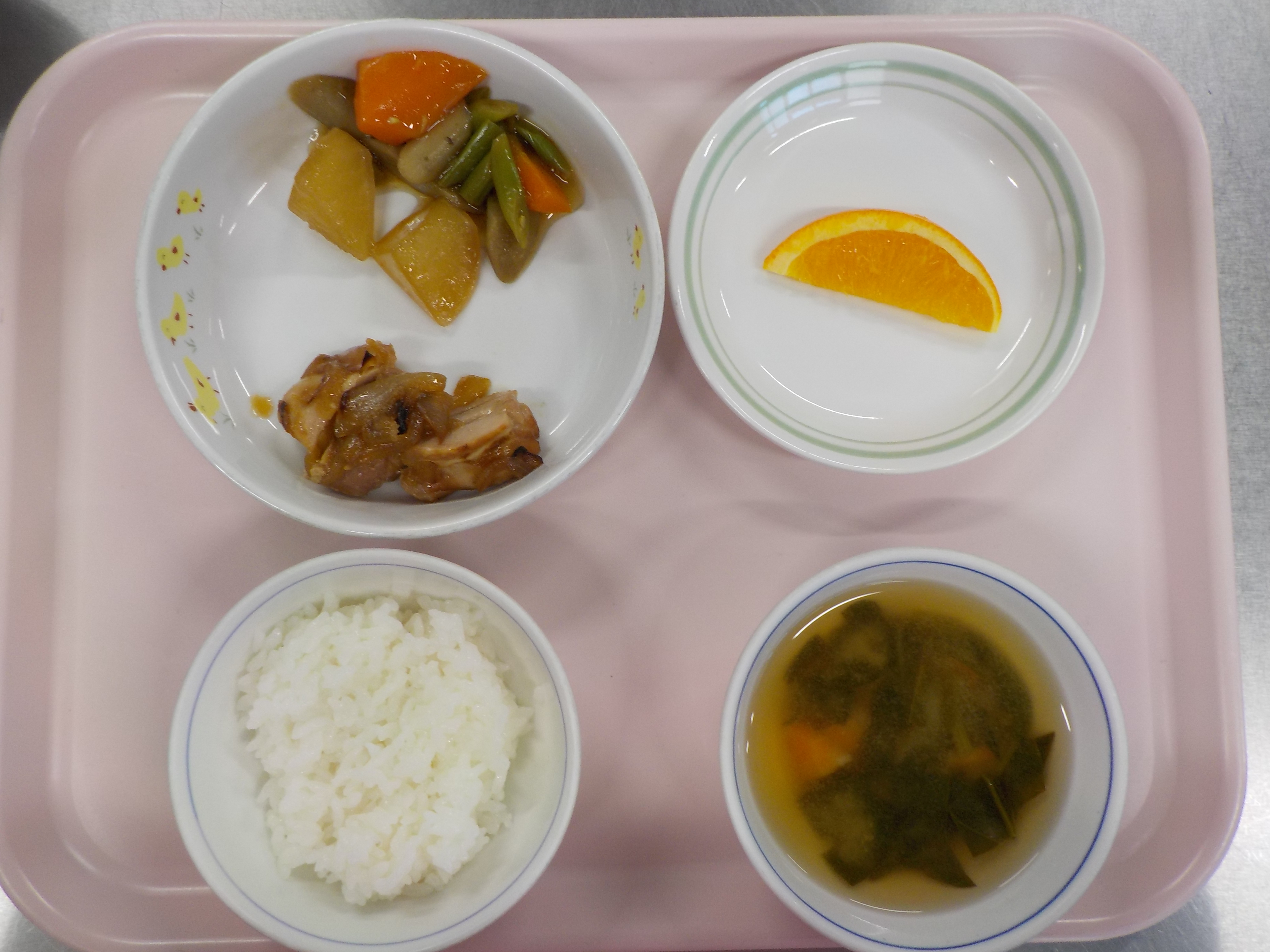 ・ご飯・鶏の生姜焼き・煮物・味噌汁・オレンジ