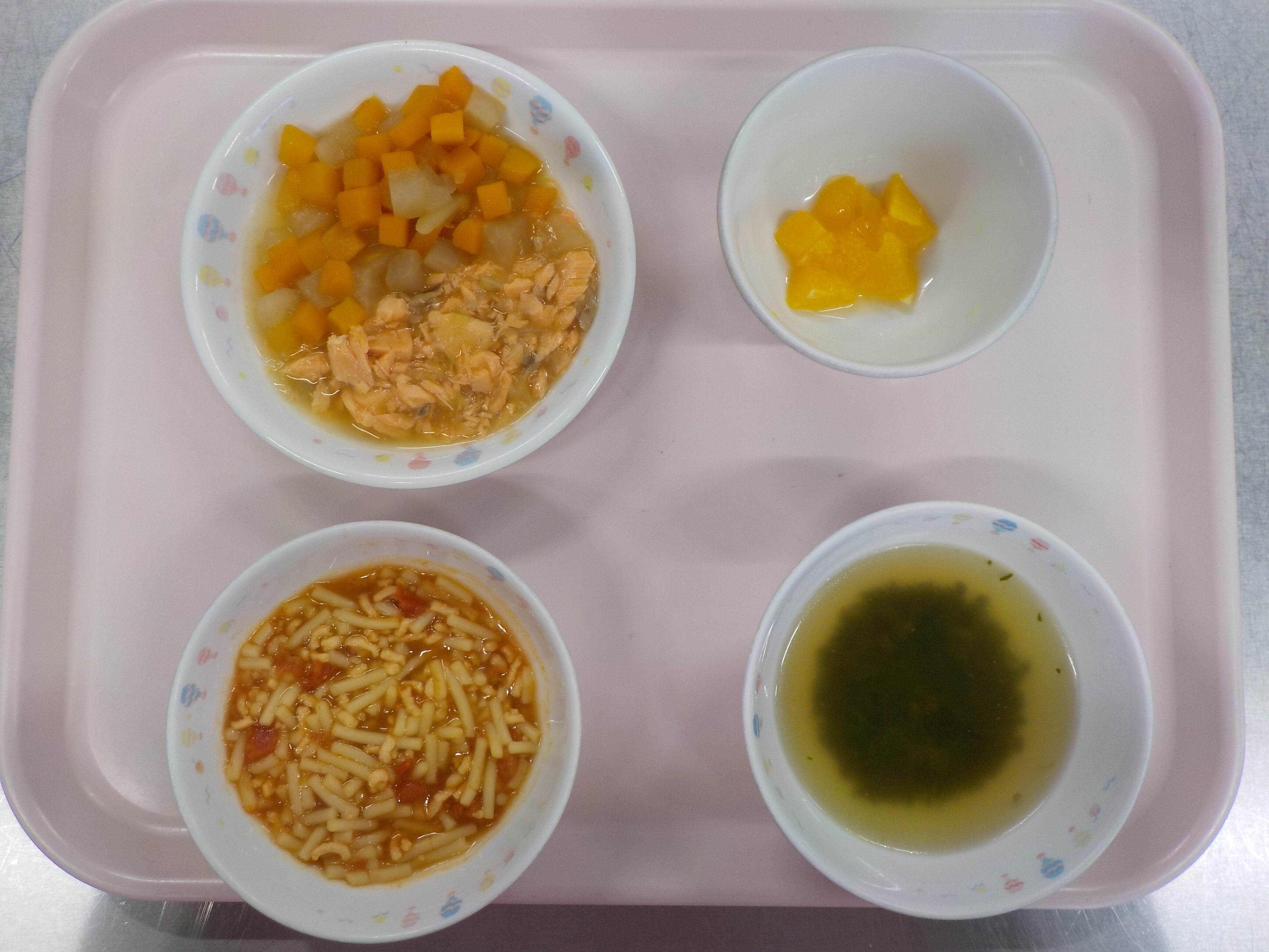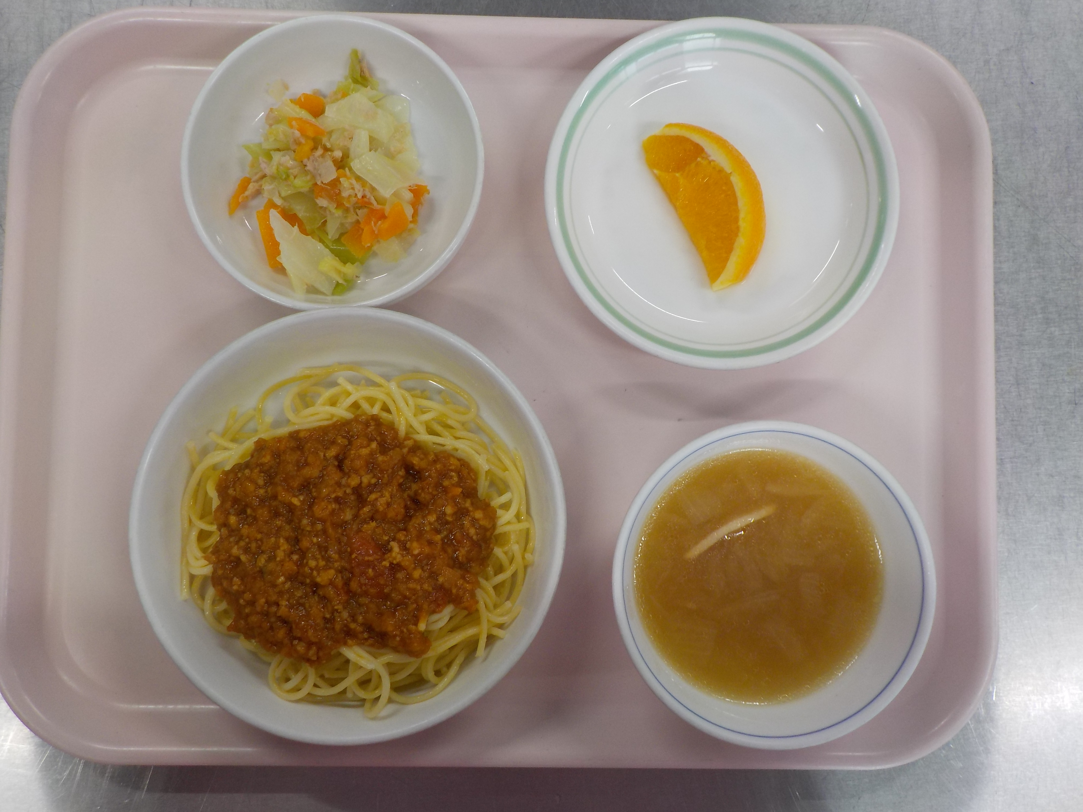 スパゲッティ(ひき肉・トマト)・鮭とキャベツ煮・人参と大根煮・ほうれん草のスープ・オレンジ